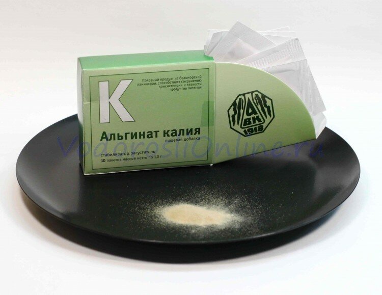 Альгинат калия представляет собой соль альгиновой кислоты. В пищевой промышленности используется в качестве загустителя и стабилизатора при производстве мороженого, молочных продуктов, желе, обогащает продукты органическим калием.
