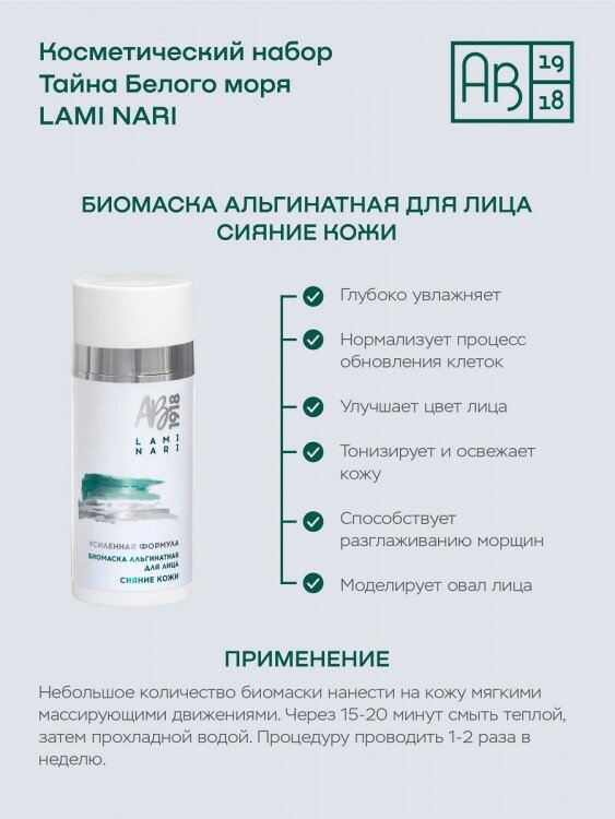 | Состав набора | СКРАБ МИНЕРАЛЬНЫЙ ДЛЯ ЛИЦА СИЯНИЕ КОЖИ + МАСЛО С ЛАМИНАРИЕЙ ДЛЯ SPA-ПРОЦЕДУР АКТИВНЫЙ ЛИФТИНГ, БИОМАСКА АЛЬГИНАТНАЯ ДЛЯ ЛИЦА СИЯНИЕ КОЖИ, КРЕМ ДЛЯ ЛИЦА ПИТАНИЕ И УВЛАЖНЕНИЯ. |