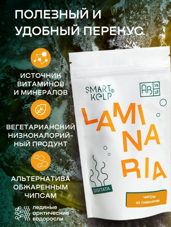 Линия СУПЕРФУД АВ1918 - продукты диетического назначения для перекуса и приготовления легких готовых блюд, рецепт которых можно найти на обороте упаковки. Подходит как для вегетарианского питания, так и для тех, кто ведет активный образ жизни. ЧИПСЫ ИЗ ЛАМИНАРИИ АВ1918 - хрустящий, быстрый и полезный перекус. Приготовлены по особой технологии, позволяющей сохранить витамины, микро- и макроэлементы, а также максимум пользы натурального морского продукта. Могут стать отличным компонентом закусок из морепродуктов, овощных салатов и вторых блюд. Не содержит консерванты, глютен, ГМО, глюконат натрия, термически обработанные растительные масла и другие искусственные ингредиенты.