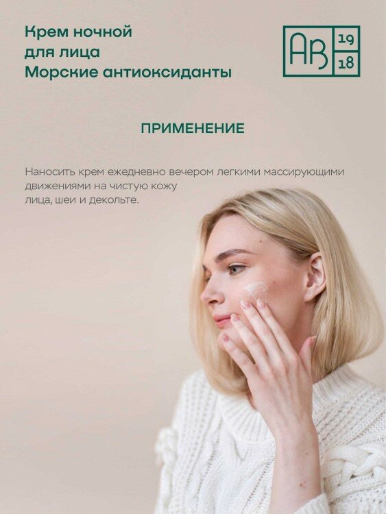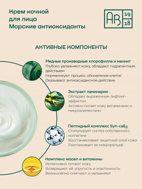 Питательный ночной крем с морскими антиоксидантами для красоты и молодости кожи лица, шеи и зоны декольте. АКТИВНОЕ ВОССТАНОВЛЕНИЕИНТЕНСИВНОЕ ПИТАНИЕЛИФТИНГ-ЭФФЕКТАКТИВНЫЕ КОМПОНЕНТЫ КРЕМА ИЗ БУРЫХ МОРСКИХ ВОДОРОСЛЕЙ (МАННИТ, ЭКСТРАКТ ЛАМИНАРИИ, КОНЦЕНТРАТ МИНЕРАЛЬНЫЙ ЛАМИНАРИИ, МЕДНЫЕ ПРОИЗВОДНЫЕ ХЛОРОФИЛЛА) восполняют недостаток влаги в коже, нормализуют процесс обновления клеток, оказывают антиоксидантное действие (замедляют процессы старения в коже). ПЕПТИДНЫЙ КОМПЛЕКС Syn-coll® стимулирует синтез собственного коллагена, восстанавливает защитный слой кожи, разглаживает ее микрорельеф. КОМПЛЕКС МАСЕЛ И ВИТАМИНЫ интенсивно питают, возвращают коже упругость и эластичность, великолепно смягчают и увлажняют ее, выравнивают тон кожи.