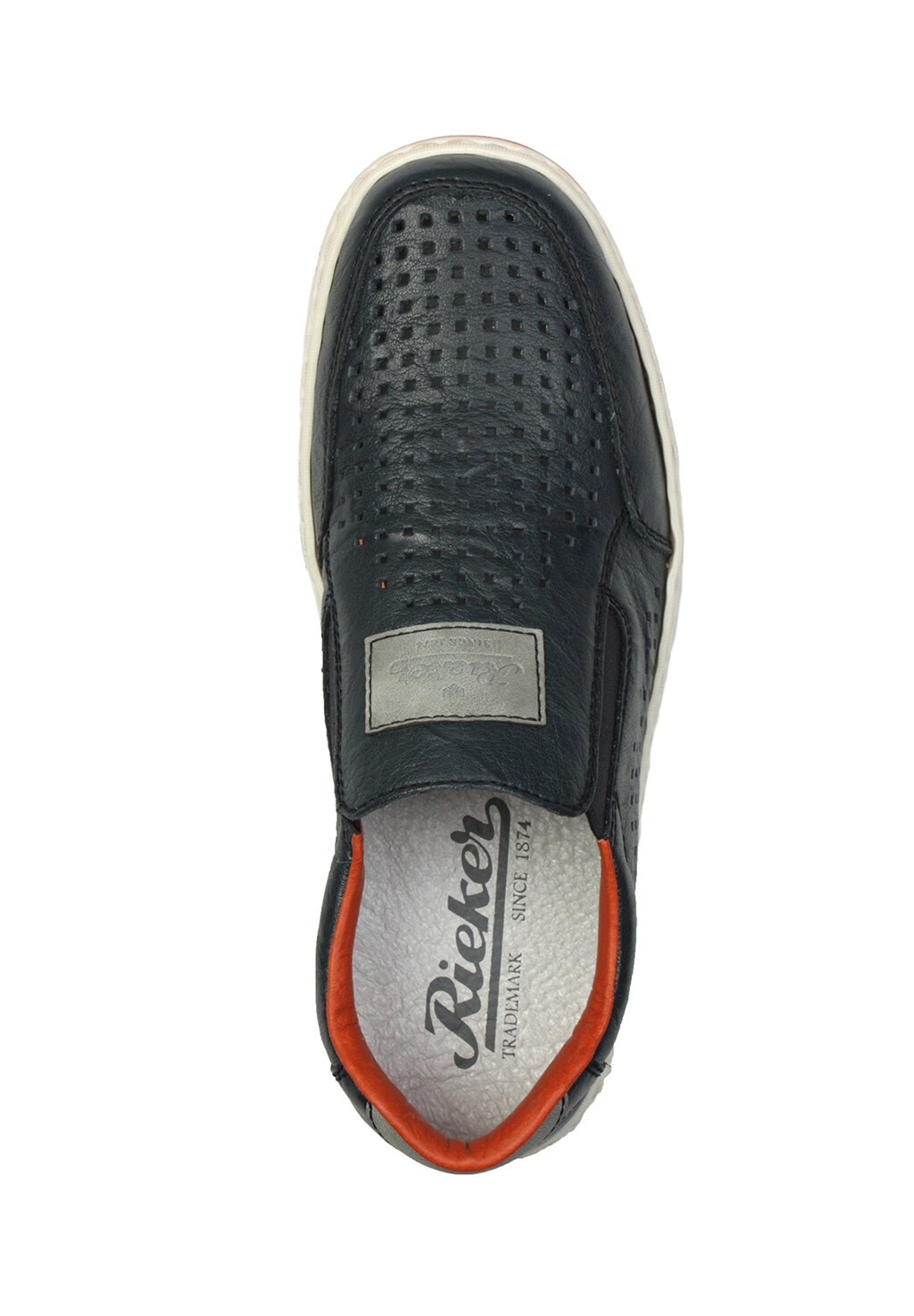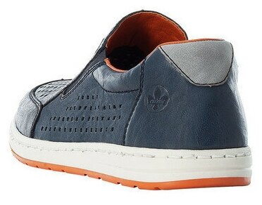Мужские перфорированные слипоны из натуральной кожи от известного европейского производителя Rieker актуального темно-синего цвета с контрастной белой подошвой и яркой оранжевой подкладкой. Главная отличительная черта обуви этого бренда - непревзойденное удобство и комфорт. Идеально подойдут на теплую весну и лето. Подкладка устойчива к износу и хорошо вентилируются. Мягкая кожаная стелька придает дополнительный комфорт стопе. Толстая подошва обладает износостойкостью, повышенной амортизацией и хорошим сцеплением с поверхностью. Удобная широкая колодка обуви адаптирована под мужскую стопу и длительную носку, а 2 эластичные вставки по бокам облегчают процесс обувания. Подходят на стандартную полноту стопы и выше.