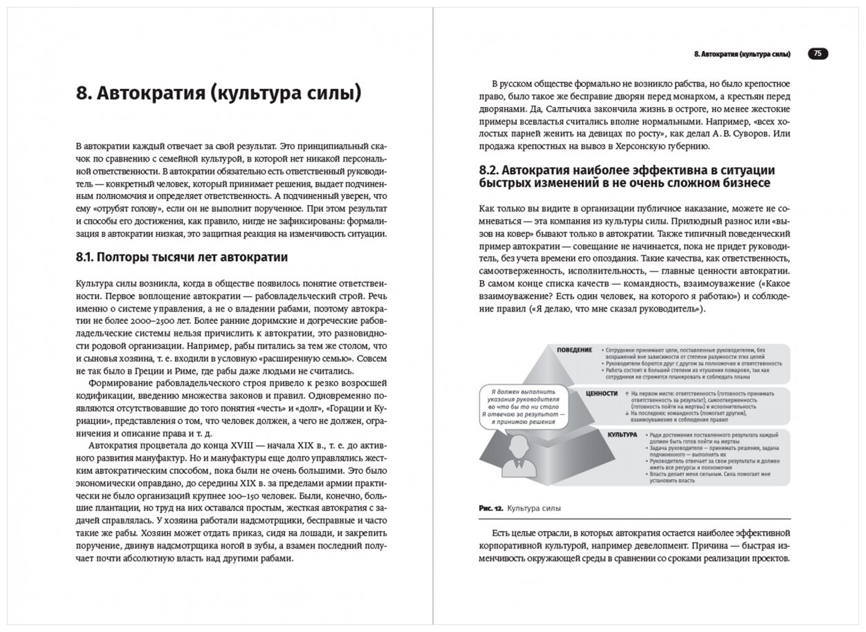 Григорий Финкелыитейн рассказывает, как подобрать лучший вид управления для своей компании и совершить переход от текущей системы к желаемой. В книге подробно разобраны четыре главных типа организаций: автократия, технократия, меритократия и демократия. Автор также уделяет внимание двум вспомогательным системам, построенным на культуре принадлежности (семья) и культуре синтеза (анархия или «бирюзовая» организация). Подробные объяснения и приведенные кейсы из опыта российских и зарубежных компаний позволяют понять, какой тип управления подойдет вашему бизнесу.