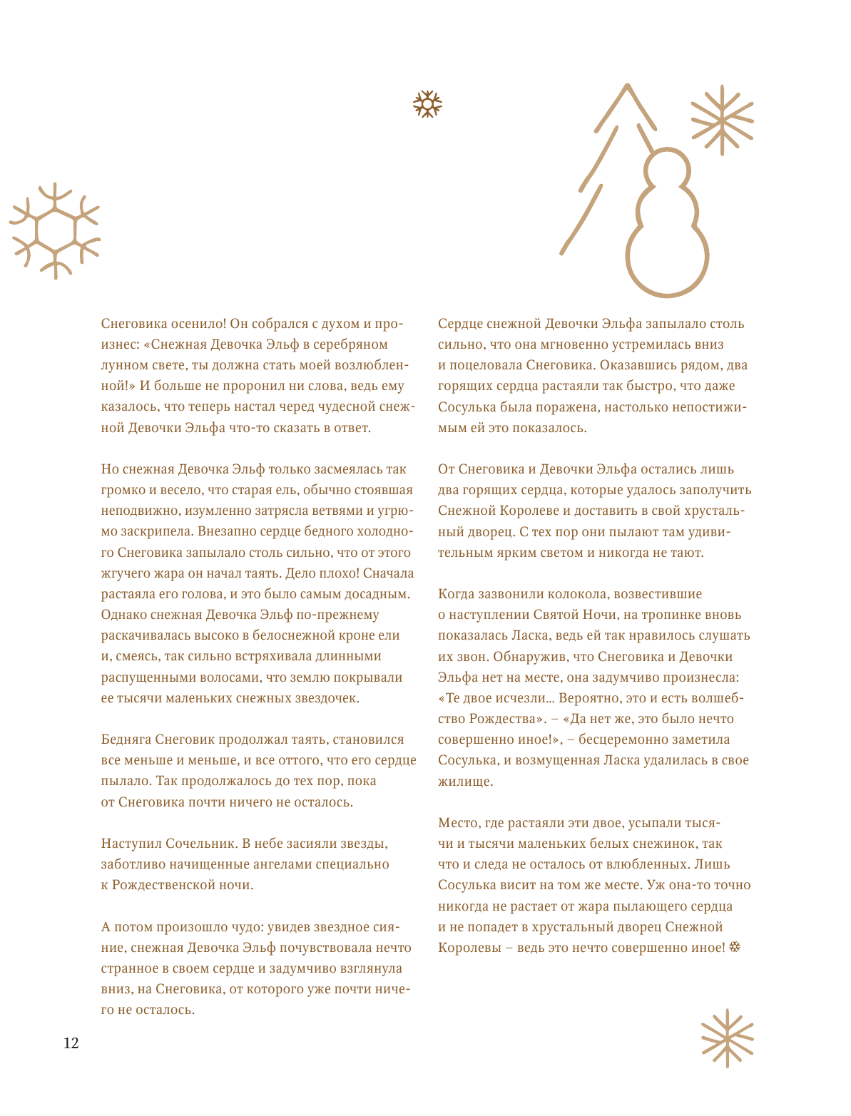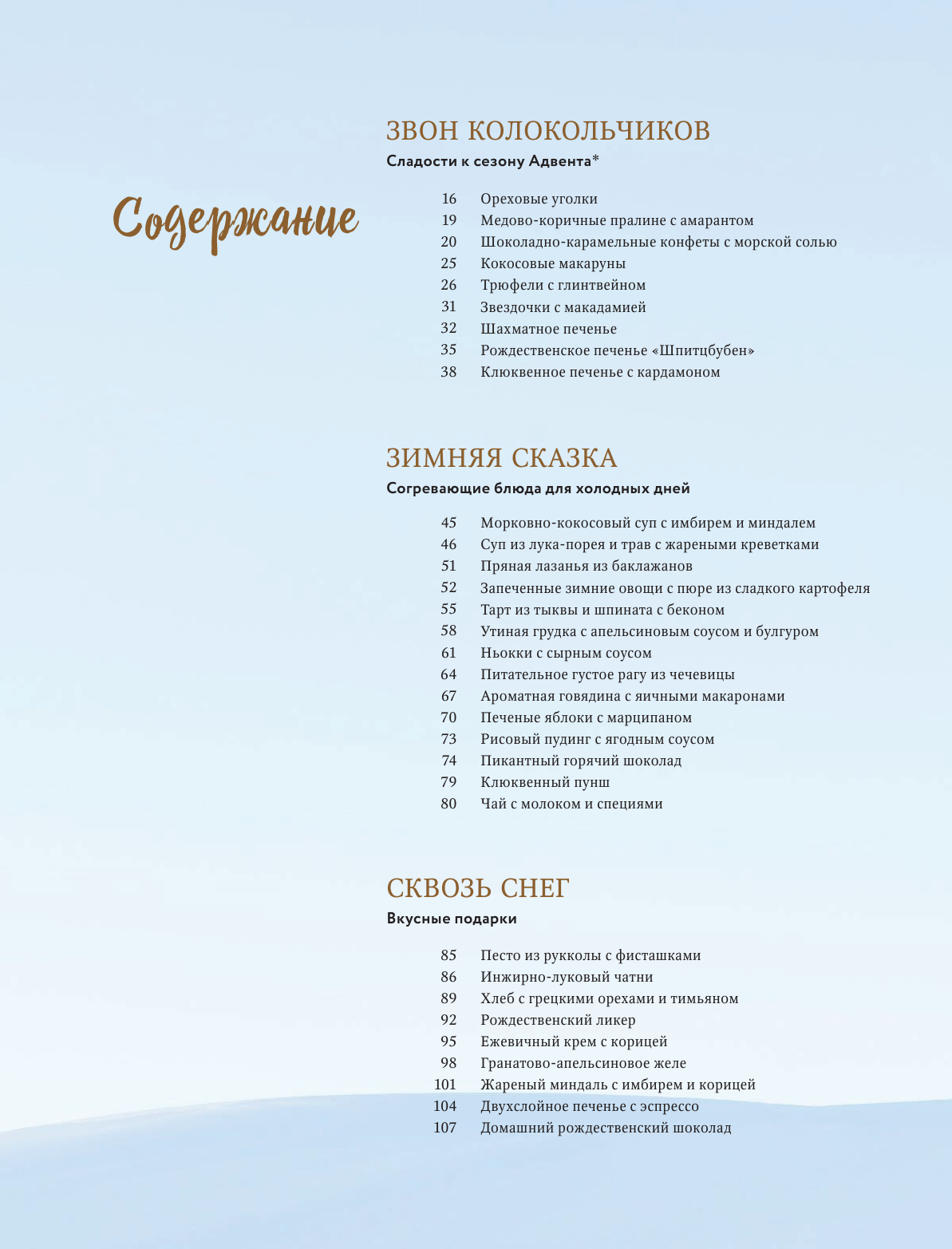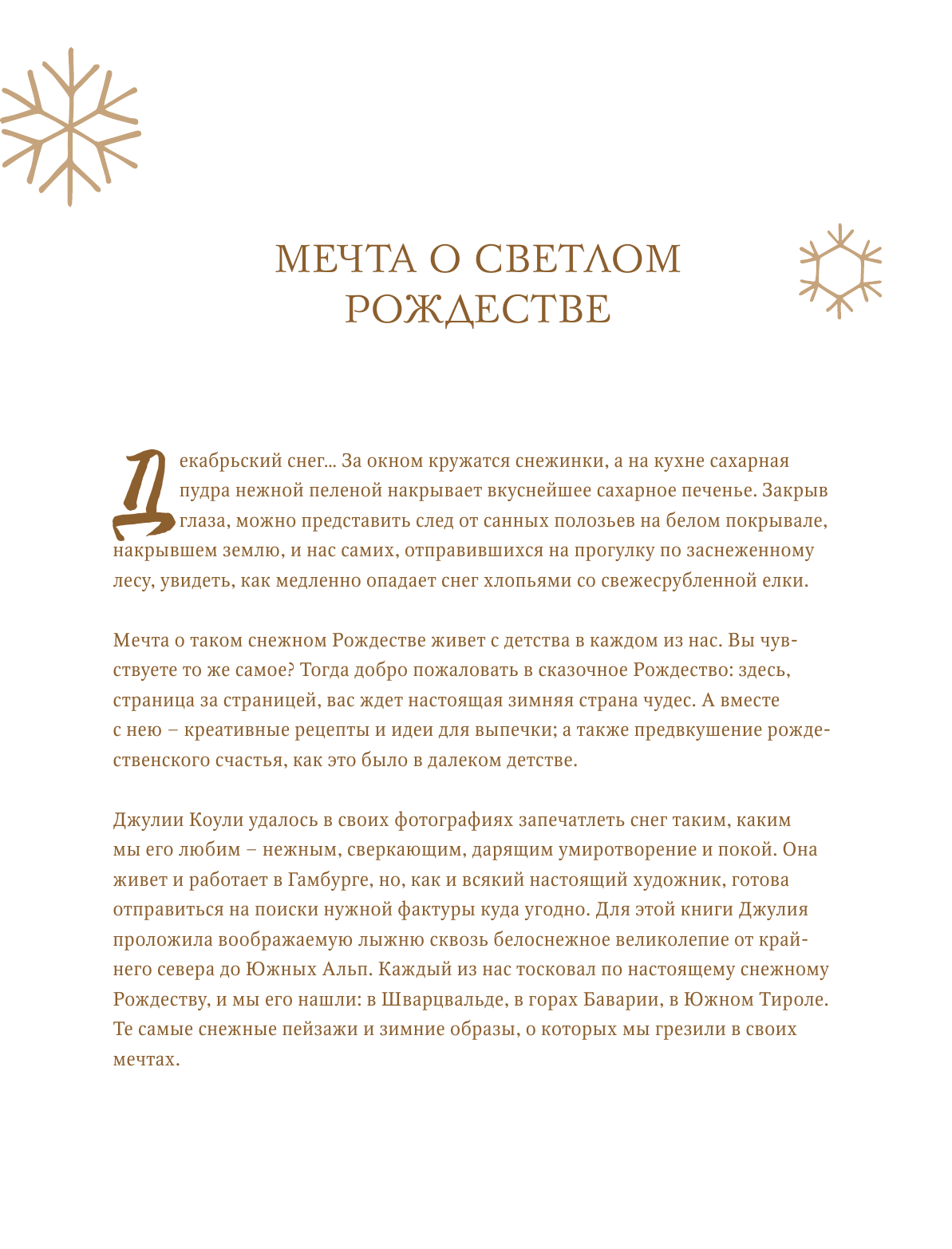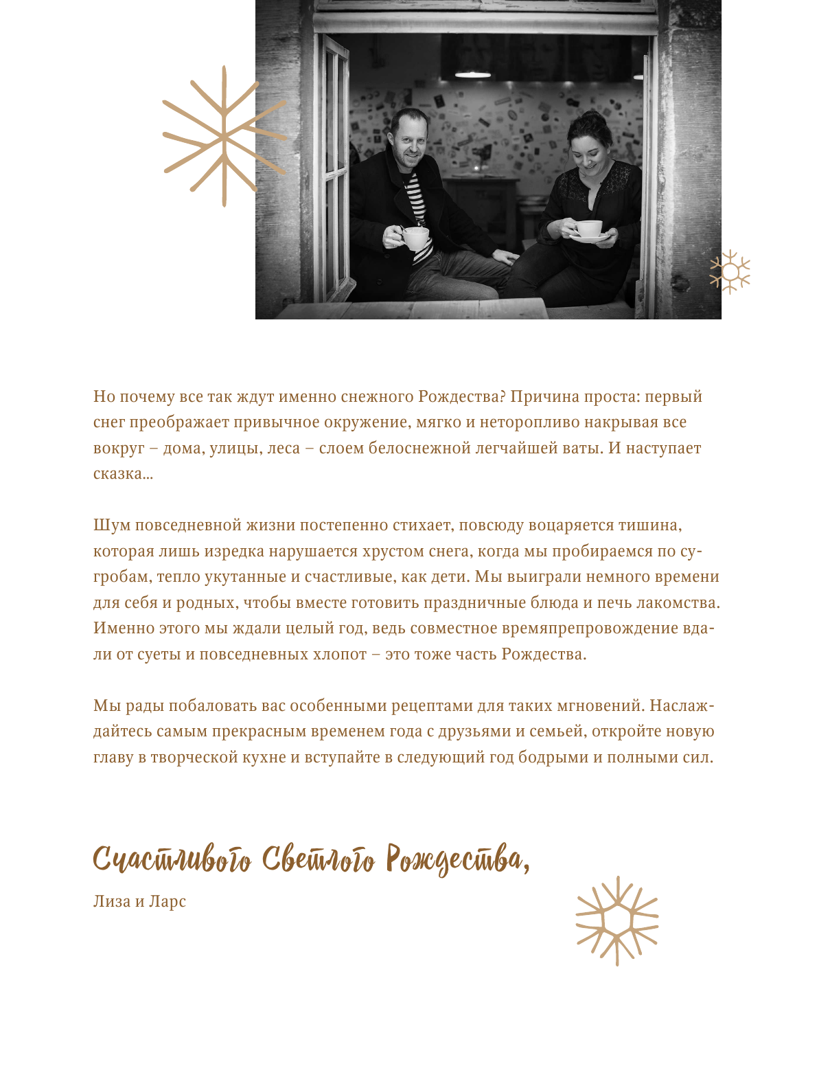 В этой книге вы найдете рецепты блюд именно под Рождество, такие как: творожный штоллен с маком и марципаном, яблочный тарт из теста фило с орехами пекан, домашний рождественский шоколад, сливочный суп из зеленого горошка с морскими гребешками, утиная грудка с апельсиновым соусом и булгуром, равиоли с каштаном и рикоттой в соусе из шалфея и лимона, каре ягненка с пюре из пастернака и хрустящим шалотом, пряничный мусс с шоколадным соусом и крокантом и множество других, простых и сложных, вкусных и ароматных, согревающих и дающих силы и энергию. Лизы и Ларса вдохновит и обрадует всех членов вашей семьи. Именно этого мы ждем целый год — совместного времяпрепровождения вдали от суеты и повседневных хлопот. В тихий праздничный вечер расположиться вокруг стола с зажженными свечами, наполненными бокалами и обилием всевозможных блюд, стоящего около зеленой наряженной красавицы. А ближе к ночи в креслах или кроватях почитать друг другу сказки о Снеговике и Сосульке, Ледяных цветах и Маленькой елочке. И ощутить себя наравне с детьми — веселыми и ожидающими от жизни только радостное.