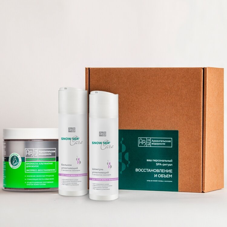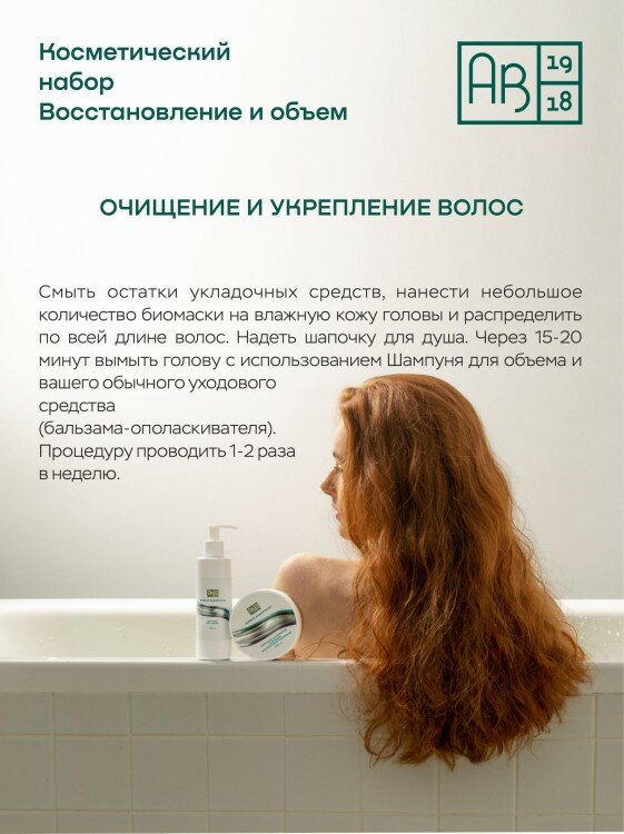 Сет из маски и шампуня для густых, сияющих здоровьем волос.Подарочный набор "Восстановление и объем" - это потрясающий сет натуральной косметики для волос, состоящий из альгинатной биомаски и шампуня для объема. Активные компоненты из арктических водорослей укрепляют волосы и предотвращают их выпадение, благотворно влияют на кожу головы, восстанавливают структуру волос, делая их крепкими и эластичными. Два косметических средства - это два шага к густым и красивым волосам, сияющим здоровьем:1 шаг. Альгинатная биомаска для оздоровления кожи головы глубоко увлажняет, нормализует жирность. Настойка стручкового перца и морские водоросли в ее составе укрепляют волосяные луковицы и ускоряют рост волос. Высокая эффективность маски доказана клинически.2 шаг. Шампунь для объема бережно очищает волосы, не пересушивая их, придает стойкий объем и облегчает укладку.Косметический набор "Восстановление и объем" станет превосходным подарком на любой праздник. Дарите здоровье и естественную красоту волос с косметикой АВ1918!