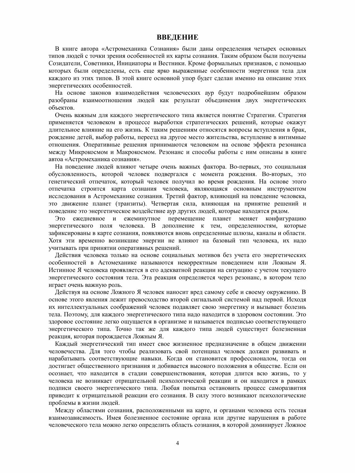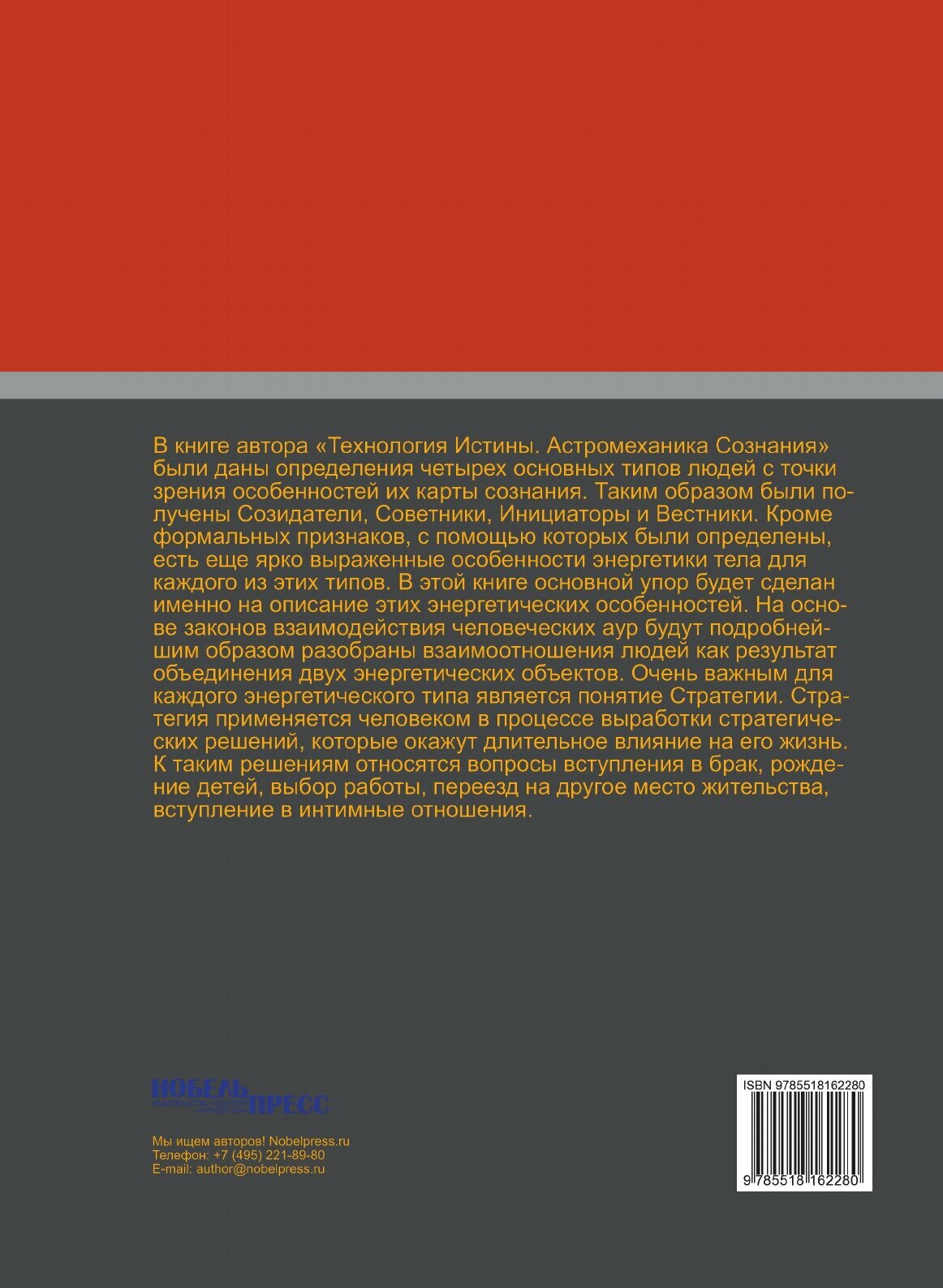 В книге автора «Технология Истины. Астромеханика Сознания» были даны определения четырех основных типов людей с точки зрения особенностей их карты сознания. Таким образом были получены Созидатели, Советники, Инициаторы и Вестники. Кроме формальных признаков, с помощью которых были определены, есть еще ярко выраженные особенности энергетики тела для каждого из этих типов. В этой книге основной упор будет сделан именно на описание этих энергетических особенностей. На основе законов взаимодействия человеческих аур будут подробнейшим образом разобраны взаимоотношения людей как результат объединения двух энергетических объектов. Очень важным для каждого энергетического типа является понятие Стратегии. Стратегия применяется человеком в процессе выработки стратегических решений, которые окажут длительное влияние на его жизнь. К таким решениям относятся вопросы вступления в брак, рождение детей, выбор работы, переезд на другое место жительства, вступление в интимные отношения.