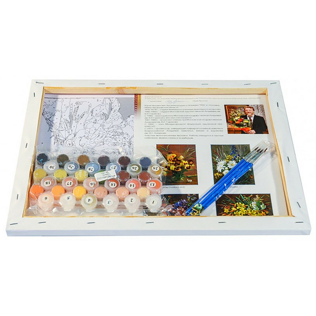 Основа картины - хлопковый холст, натянутый на деревянный подрамник. На холст нанесена схема, разделенная на области для закрашивания. Цифра внутри каждой области указывает на номер краски, которой необходимо закрасить данный участок. В комплект входят акриловые краски на водной основе, экологически безопасные, без запаха, быстросохнущие. Картина раскрашивается без смешивания красок. Набор комплектуется специальными кистями разного размера с искусственным ворсом для акриловых красок.