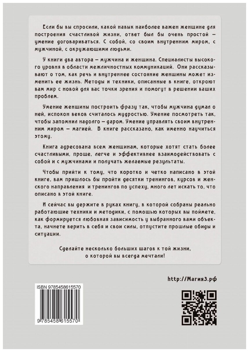 Если бы вы спросили, какой навык наиболее важен женщине для построения счастливой жизни, ответ был бы очень простой – умение договариваться. С собой, со своим внутренним миром, с мужчиной, с окружающими людьми. У книги два автора – мужчина и женщина. Специалисты высокого уровня в области межличностных коммуникаций. Они рассказывают о том, как речь и внутреннее состояние женщины может изменить ее жизнь. Методы и техники, описанные в книге, откроют вам мир с новой для вас точки зрения и помогут в решении ваших проблем. Умение женщины построить фразу так, чтобы мужчина думал о ней, испокон веков считалось мудростью. Умение посмотреть так, чтобы запомнил надолго – даром. Умение управлять своим внутренним миром – магией. В книге рассказано, как именно научиться этому. Книга адресована всем женщинам, которые хотят стать более счастливыми, проще, легче и эффективнее взаимодействовать с собой и с мужчинами и получать желаемые результаты. Чтобы прийти к тому, что коротко и четко написано в этой книге, вам пришлось бы пройти десятки тренингов, курсов и женского направления и тренингов по успеху, много лет искать то, что описано в этой книге. И сейчас вы держите в руках книгу, в которой собраны реально работающие техники и методики, с помощью которых вы поймете, как формируется любовная зависимость у выбранного вами объекта, начнете верить в себя и свои силы, отпустите прошлые обиды и ситуации. Сделайте несколько больших шагов к той жизни, о которой вы всегда мечтали!