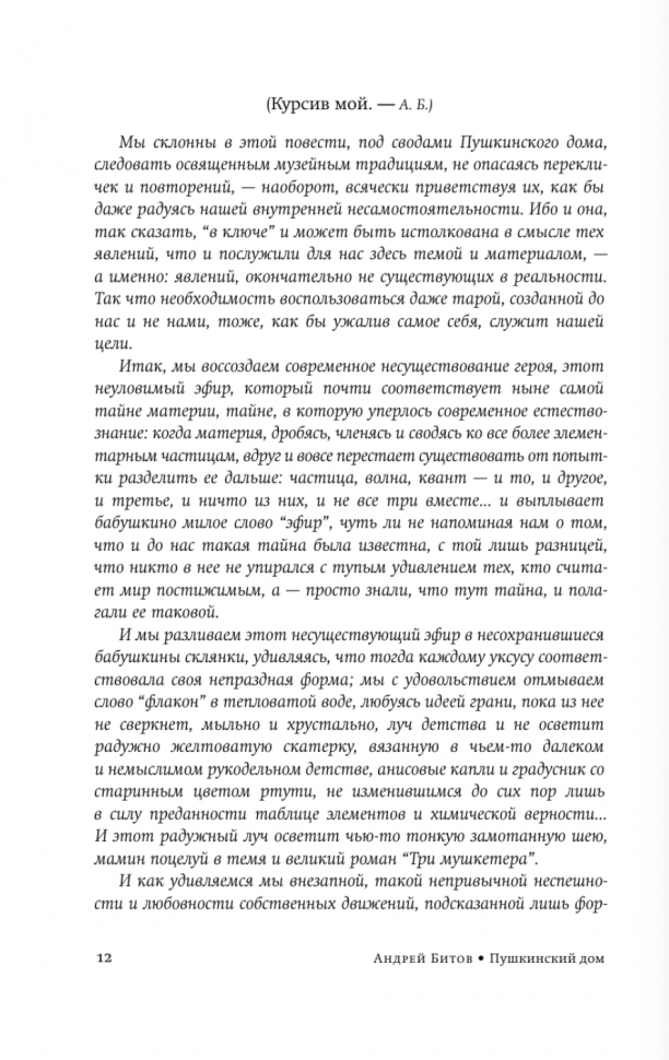 Битов - к сожалению, весьма недооцененный классик, возможно из-за нестандартности, необычности поднимаемых вопросов - метафизических, по большей части, и авторского стиля. Считаю "Пушкинский дом" венцом творчества автора. Роман дарит ни с чем не сравнимое эстетическое удовольствие, заставляя по новому взглянуть на, а точнее, заглянуть за знакомые со школьной скамьи строки такого родного Александра Сергеевича.