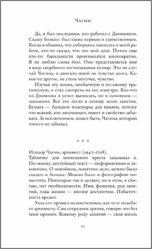 История жизни Исидора Чагина, рассказанная им самим в дневнике и людьми, знавшими его в разные периоды жизни. Одаренный юноша, глубоко порядочный человек ("благородный муж" конфуцианской традиции), гениальный резидент, яркий талантливый артист, романтический возлюбленный - и это все о нем. Уникальность "Чагина", для меня, по крайней мере, прежде такого не встречала, в том, что одним из летописцев выступит человек, разрушивший его жизнь. Ту жизнь, в которой он мог быть счастливым мужем и отцом, успешным ученым, патриархом большого клана, известным, обеспеченным, уважаемым.