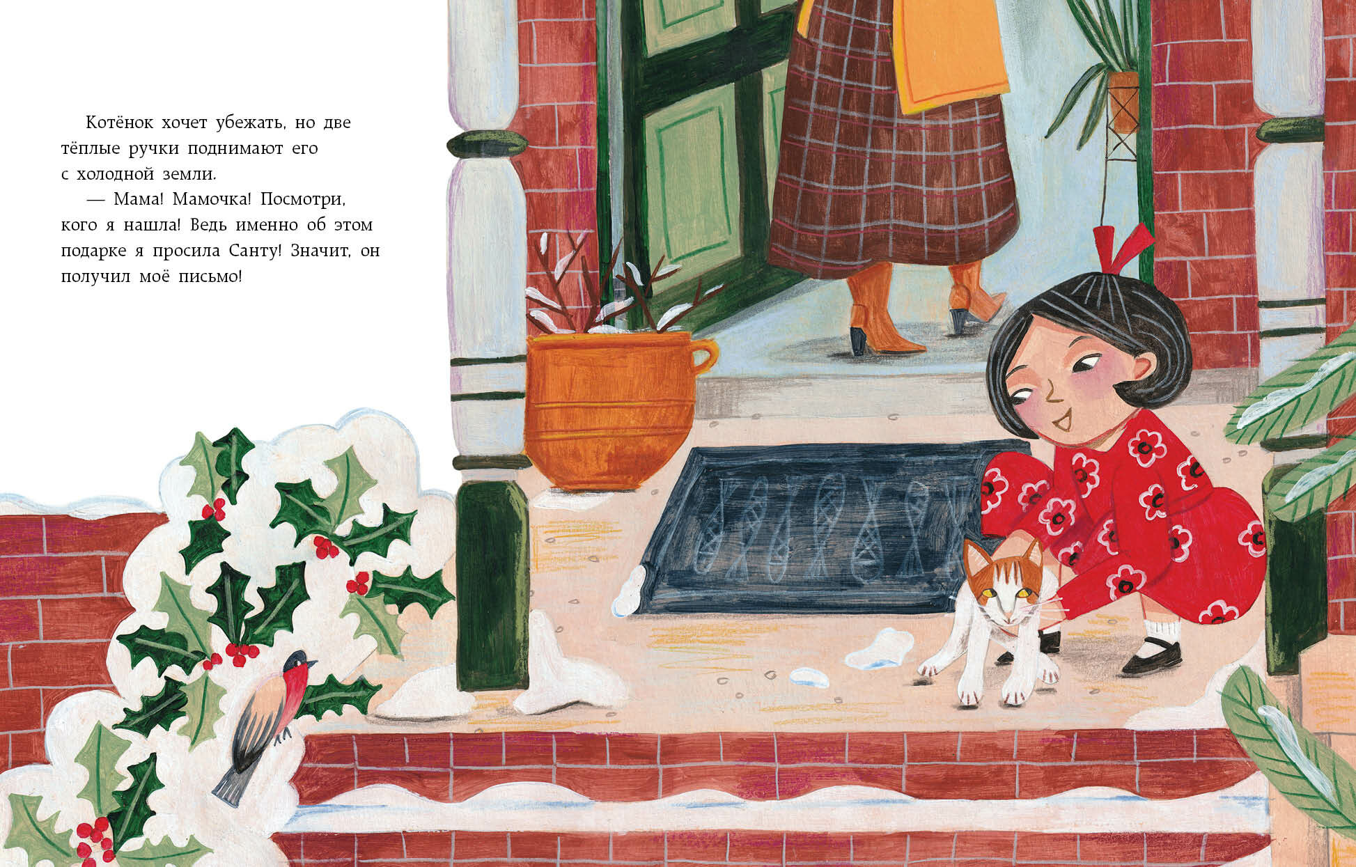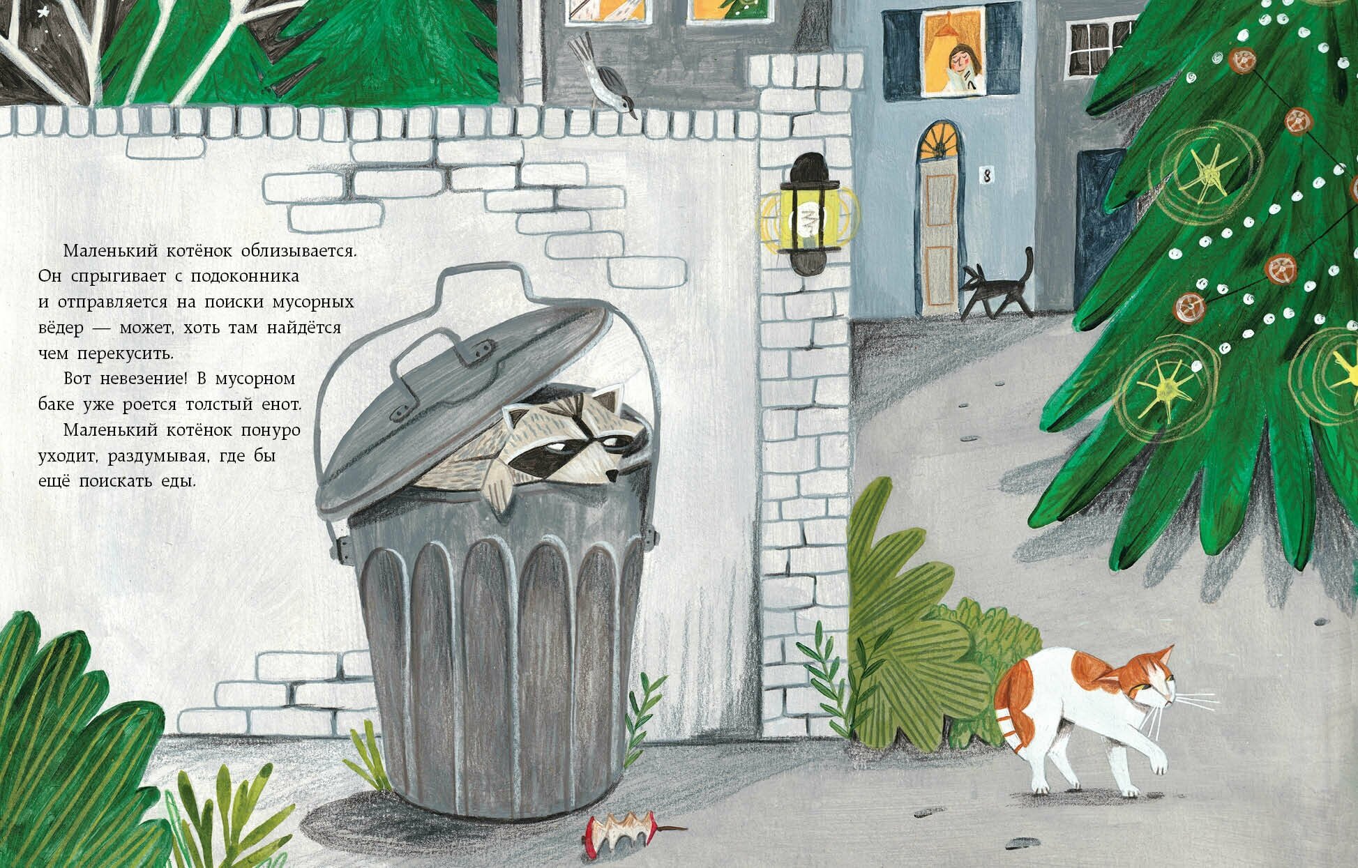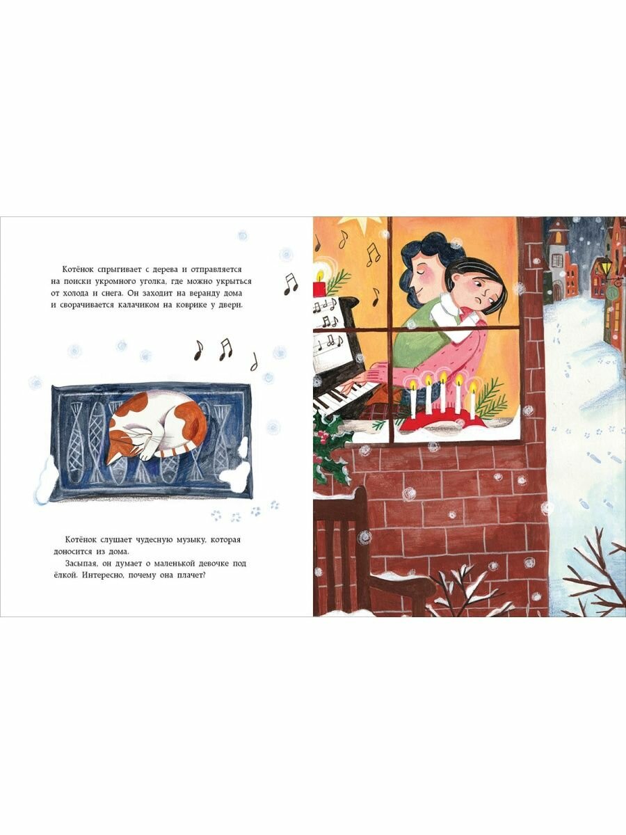 Ещё одна рождественская сказка в домашнюю коллекцию зимних книжек! Очень тёплые и уютные иллюстрации — с такими только и закутаться в плед рядом с камином с чашкой какао и в обнимку с ребёнком. Книга подойдёт не только для совместного чтения, но и в качестве подарка — в детском саду, начальной школе или деткам друзей. Понравилось, что иллюстрации оформлены в европейском стиле, душевные, красочные и детализированные — есть что рассмотреть. Сама история добрая, про маленького котёнка, который бродит в одиночестве по улице, пока люди готовятся к Рождеству. И про девочку, которая тоже мечтает о друге. Как водится в жизни и в этой истории, под Рождество часто случаются чудеса. Дети, мне кажется, любят такие книги — про других детей, про зверят, про волшебство. Приятного чтения и с наступающими праздниками!