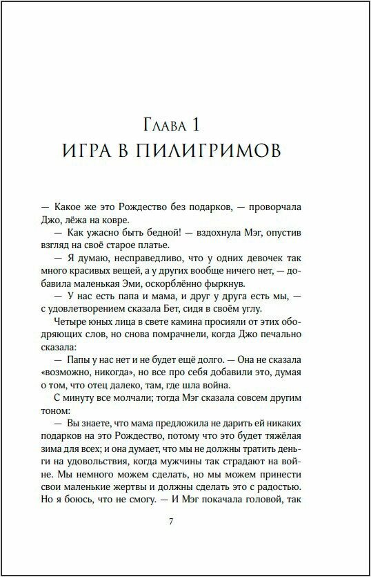 Честно, ожидала большего, но роман мне всё-таки понравился. Книга, как мне кажется, придётся по вкусу подросткам 13-15 лет, она возможно сможет чему-то и научить, ведь в ней поднимаются темы милосердия, работы над собой, самоотверженности. Во время чтения, у меня было чувство невероятной теплоты и уюта, я очень прониклась к сёстрам Марч. Они такие настоящие, с детской наивностью и глупостью (в хорошем смысле), часто вызывали улыбку их диалоги между собой. Очень мне понравились отношение между мамой и дочерьми, для них она являлась примером, была наставником в тяжелое время, заменила им отца, когда он был на войне.