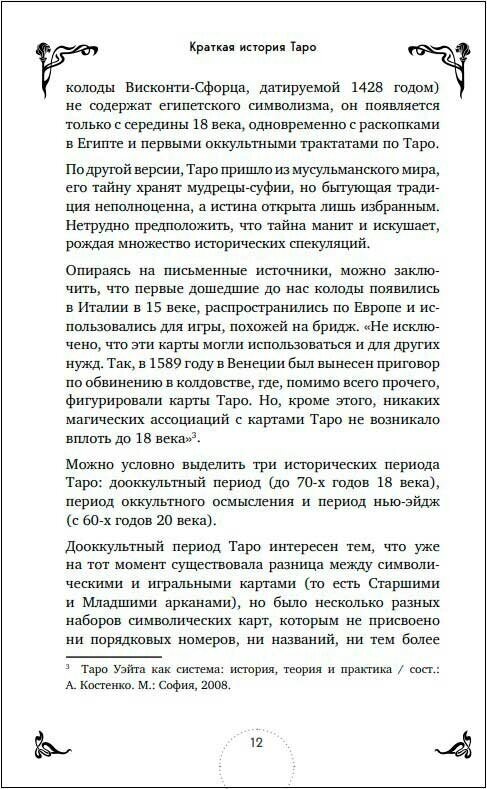 Книгу купила сразу, как только увидела на нее анонс! Не пожалела, так как с данным автором уже знакома после книги "Таро в работе психолога". Надо сказать, что текст первой книги здесь естественно присутствует в полном объеме. Но книга построена очень удачно, от простого к сложному, подача материала более структурирована и напечатана крупным читаемым шрифтом, так что в этом издании воспринимается гораздо лучше. Очень подробно описаны архетипы арканов и их психологические проекции, очень удачно поданы приципы использования таро в психологической консультации, дан экскурс в работу таролога вообще и приведены параллели с работой психолога. Книга хорошо иллюстрирована, подача информации приятна глазу и хорошо структурировано. К разделу расклады добавлены новые авторские наработки, расклады емкие и интересные.