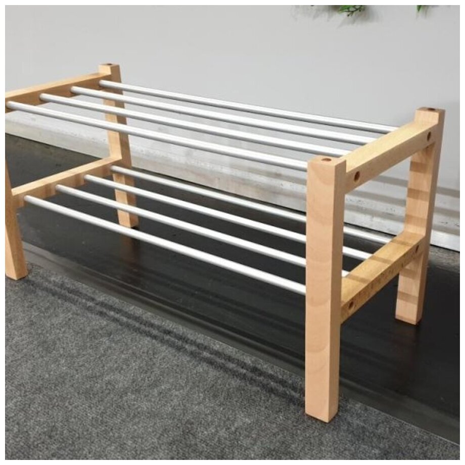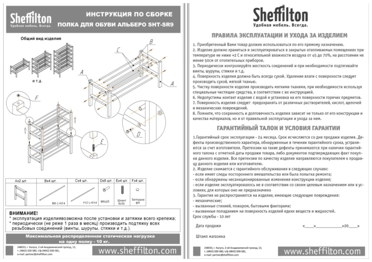 Полка для обуви Цвет: венге/алюм.металлик Материал: дерево/металл Вес изделия, кг: 3.90 Размер изделия: Ширина 650 мм Глубина 290 мм Высота 640 мм Проштабелированная полка для обуви. Соединительный переходник в комплекте каждой полки. Выполнена из массива древесины, брус 34х24 мм., и металла, труба 12х0,8 мм. Расстояние между полками: 140 мм. Расстояние от пола до нижней полки: 100 мм. Ширина одной полки позволяет свободно вместить до 3 пар обуви. Полка штабелируется, что позволяет экономить место и хранить больше обуви. Максимальная распределенная статическая нагрузка на одну полку - 10 кг. Деревянные детали могут немного отличаться по оттенку из-за неоднородности структуры дерева. Изделие полностью разборное.