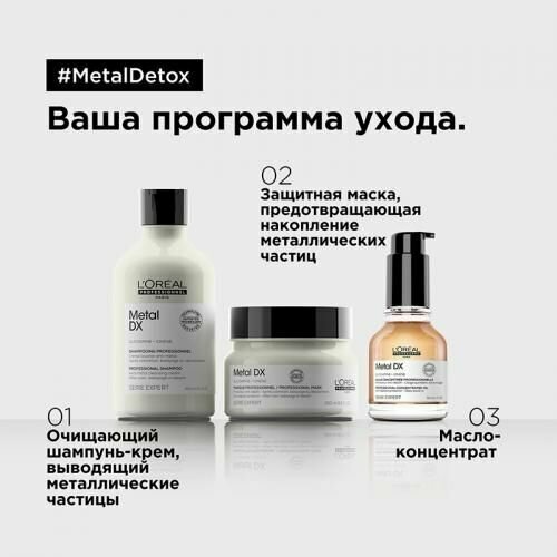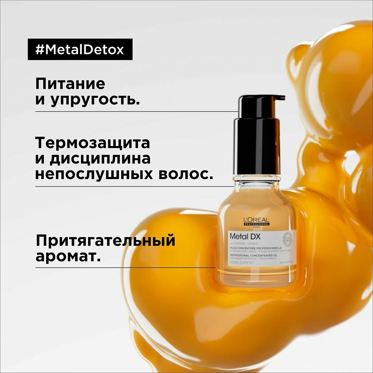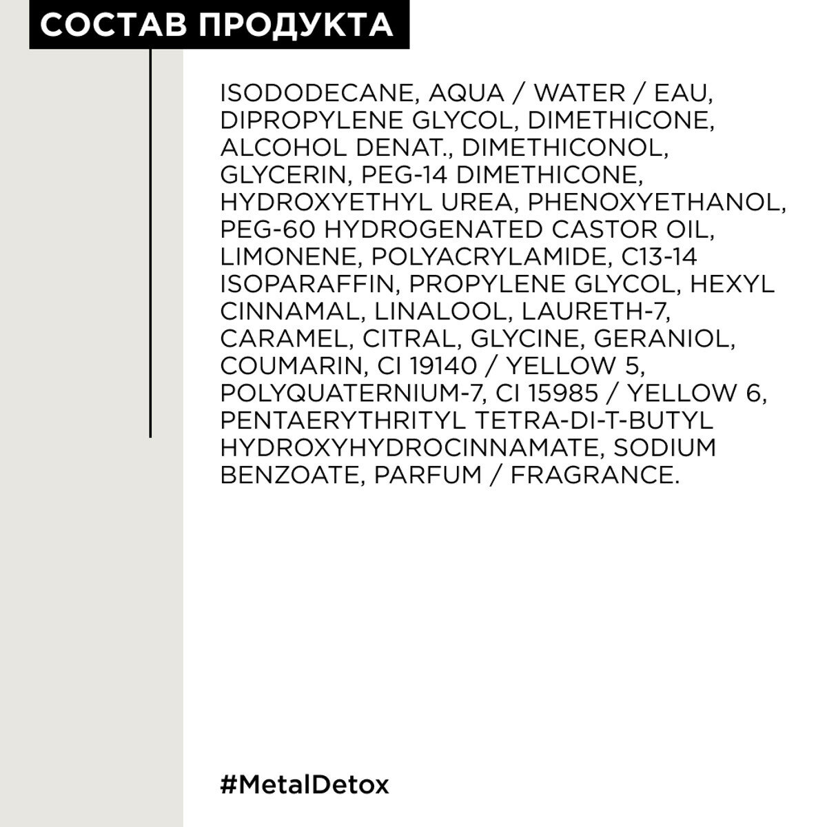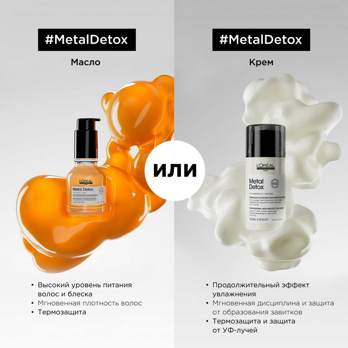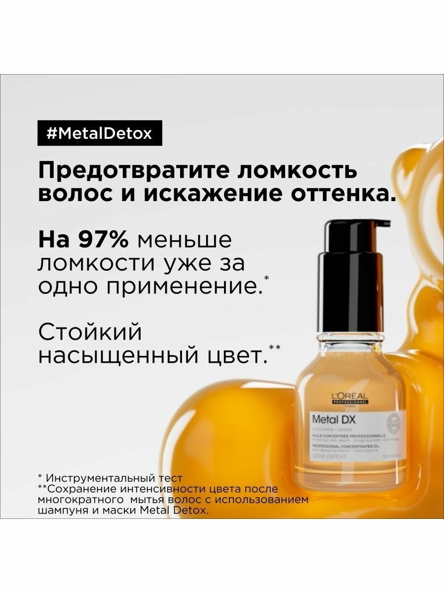 Масло-концентрат Metal Detox сохраняет цвет, предотвращает искажение оттенка и защищает волосы от ломкости.