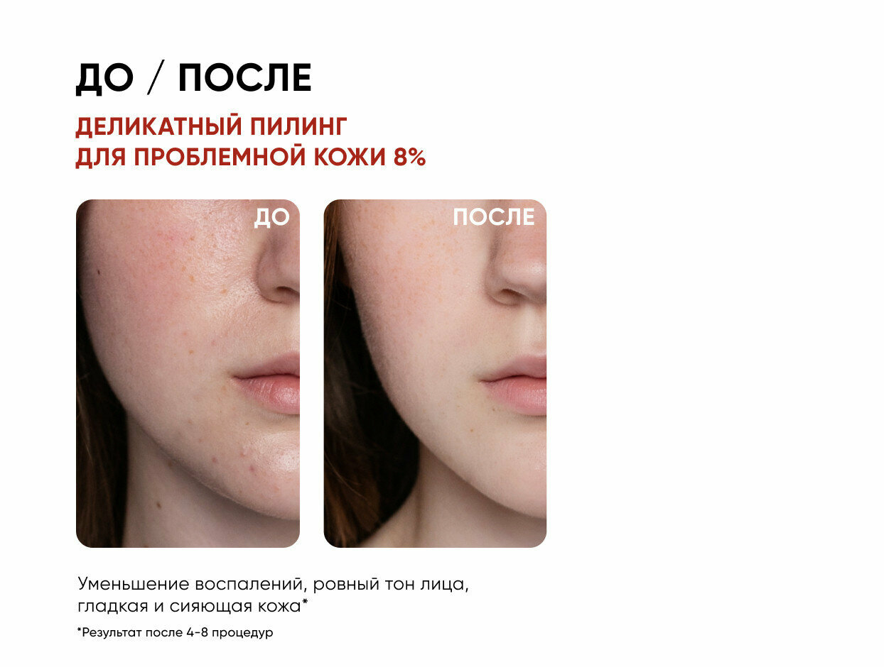 Смарт-пилинг система 8% на основе миндальной, азелаиновой и салициловой кислот. Нежная эксфолиация без раздражения и шелушения.