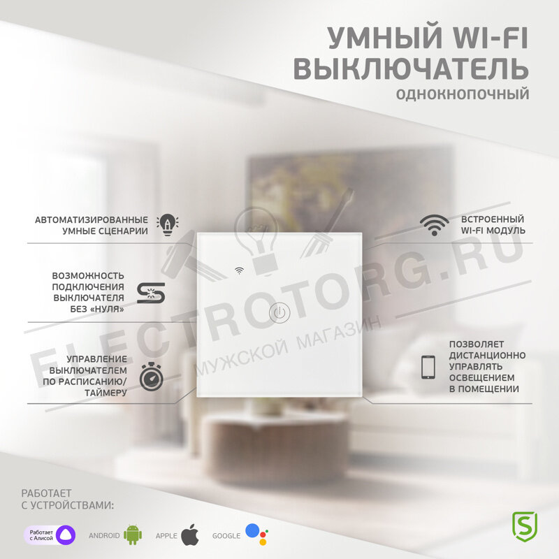 Сенсорный однокнопочный выключатель белого цвета предназначен для управления освещением в помещениях разного типа. Высокотехнологичное устройство с панелью, изготовленной из прочного закаленного стекла, мгновенно срабатывает при легком нажатии на сенсорную кнопку. Управление прибором может выполняться дистанционно с помощью смартфона. Пользователь может устанавливать точное время включения/выключения световых приборов. Устройство выключателя позволяет использовать его с подключением без нулевого провода. Совместимость с голосовым помощником Алиса позволяет управлять устройством при помощи голосовых команд.Это компактное устройство позволяет оптимизировать расход электроэнергии. Выключатель может использоваться самостоятельно, а также совместно с другими устройствами интеллектуальной системы «Умный дом» и принимать участие в автоматизированных умных сценариях. Конструкция аккуратно монтируется в стену, не нарушая дизайн интерьера.