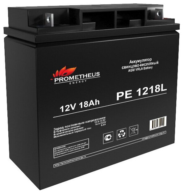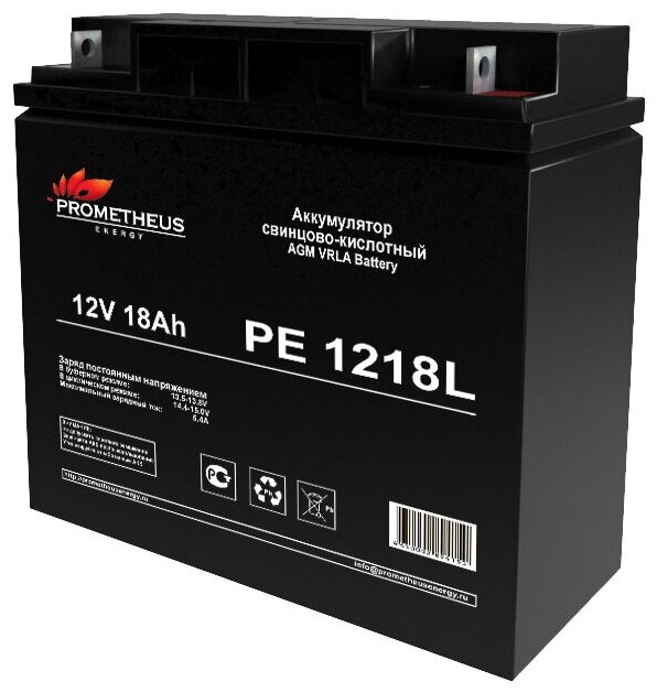 Свинцово-кислотный аккумулятор РЕ 1218L создан по технологии AGM, с абсорбированным электролитом и увеличенным сроком службы. Предлагаемый аккумулятор является не обслуживаемым. Он герметизирован, а образующийся газ рекомбинируется. Долив жидкости не требуется. Корпус аккумулятора изготовлен из негорючего ABS пластика. Емкость аккумуляторной батареи для ИБП составляет 18 Ач, а рабочее напряжение 12 В. Устройство обладает низким саморазрядом(до 3%).