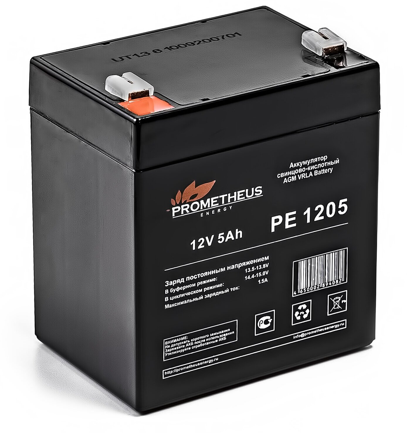 Свинцово-кислотный аккумулятор Prometheus Energy PE 1205 создан по технологии AGM, с абсорбированным электролитом. Предлагаемый аккумулятор является не обслуживаемым. Он герметизирован, а образующийся газ рекомбинируется. Долив жидкости не требуется. Корпус аккумулятора изготовлен из негорючего ABS пластика. Емкость аккумуляторной батареи для ИБП составляет 5Ah, а рабочее напряжение 12 V. Устройство обладает низким саморазрядом(до 3%).