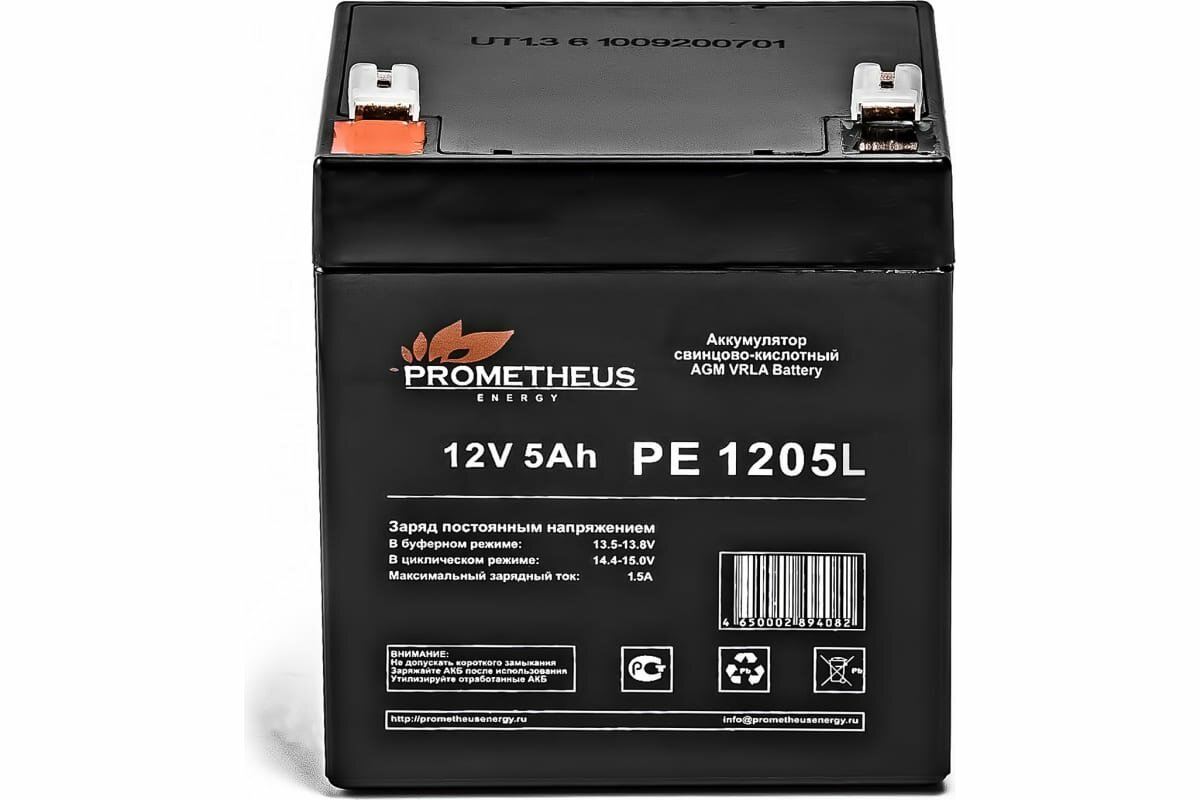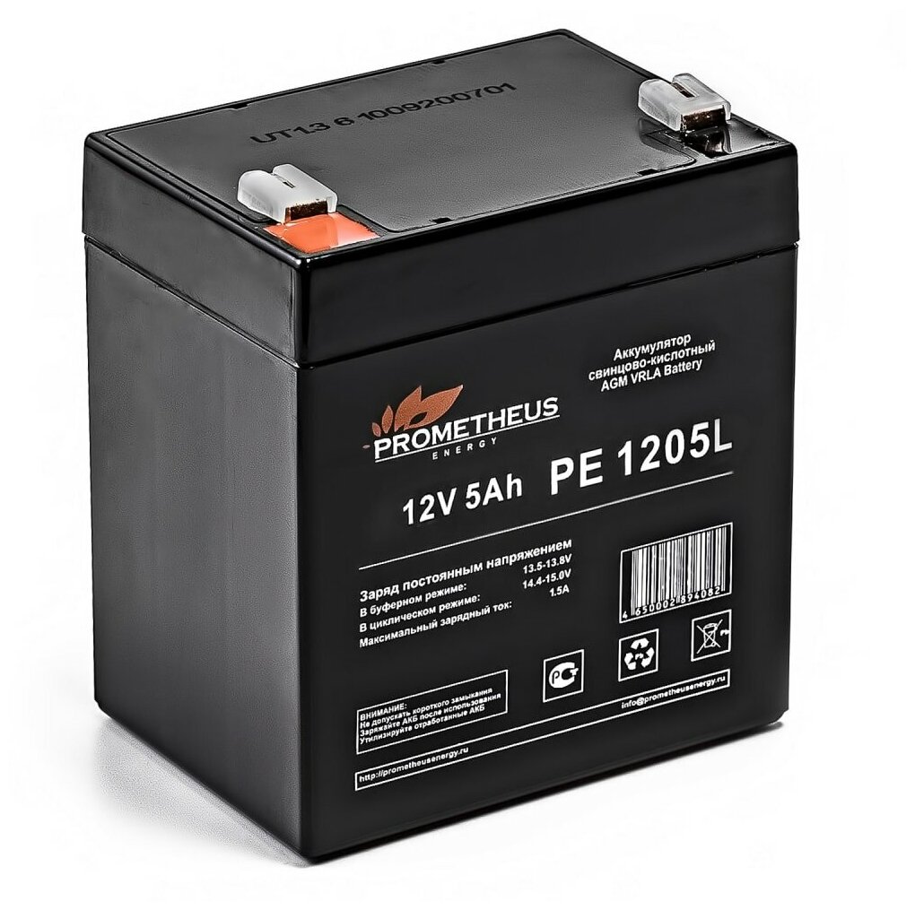 Свинцово-кислотный аккумулятор Prometheus Energy PE 1205L создан по технологии AGM, с абсорбированным электролитом и увеличенным сроком службы. Предлагаемый аккумулятор является не обслуживаемым. Он герметизирован, а образующийся газ рекомбинируется. Долив жидкости не требуется. Корпус аккумулятора изготовлен из негорючего ABS пластика. Емкость аккумуляторной батареи для ИБП составляет 5Ah, а рабочее напряжение 12 V. Устройство обладает низким саморазрядом(до 3%).