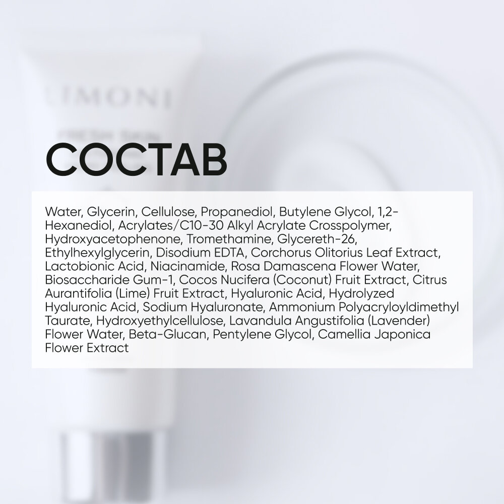 | Состав | Water, Glycerin, Cellulose, Propanediol, Butylene Glycol, 1,2-Hexanediol, Acrylates/C10-30 Alkyl Acrylate Crosspolymer, Hydroxyacetophenone, Tromethamine, Glycereth-26, Ethylhexylglycerin, Disodium EDTA, Corchorus Olitorius Leaf Extract, Lactobionic Acid, Niacinamide, Rosa Damascena Flower Water, Biosaccharide Gum-1, Cocos Nucifera (Coconut) Fruit Extract, Citrus Aurantifolia (Lime) Fruit Extract, Hyaluronic Acid, Hydrolyzed Hyaluronic Acid, Sodium Hyaluronate, Ammonium Polyacryloyldimethyl Taurate, Hydroxyethylcellulose, Lavandula Angustifolia (Lavender) Flower Water, Beta-Glucan, Pentylene Glycol, Camellia Japonica Flower Extract |