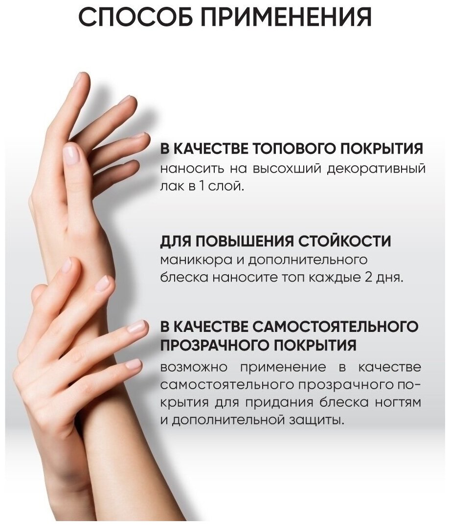 | Способ применения | в качестве топового покрытия наносить на высохший декоративный лак в 1 слой. для повышения стойкости маникюра и дополнительного блеска наносите топ каждые 2 дня. |