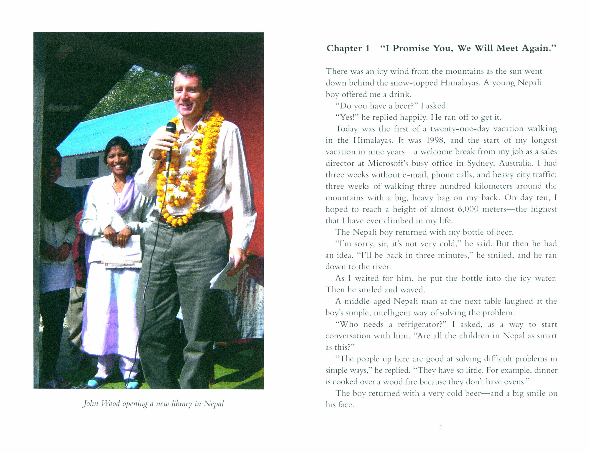 In 1998 John Wood worked for Microsoft in Australia. He was a busy, successful man. Then he went on vacation to Nepal and visited a school in a Himalayan village, this changed his life. He helped the school and decided to change the World! He started the charity ‘Room to Read’...