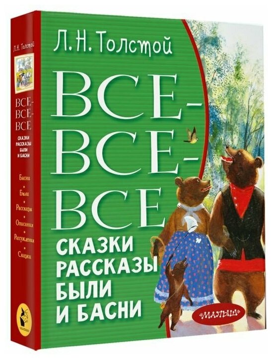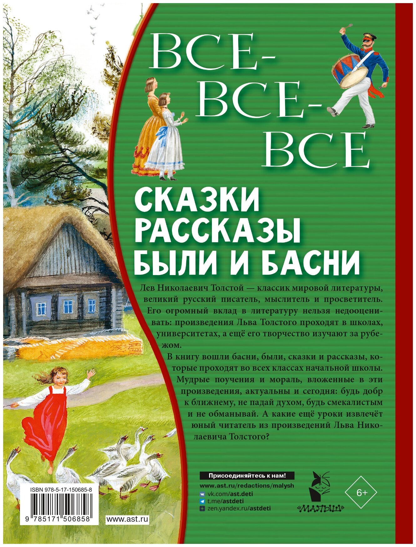 В книгу "Все-все-все сказки, рассказы, были и басни" вошли произведения, которые проходят во всех классах начальной школы. Мудрые поучения и философские подтексты произведений Льва Толстого разбирают на уроках в школе и ставят в пример: будь честным, не жадничай, живи с добрыми мыслями и не делай плохого.