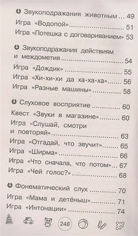 Все игры распределены по разделам: эмоциональные игры, имитация, указательный жест, звукоподражание, слуховое восприятие, фонематический слух, дыхательные техники. -