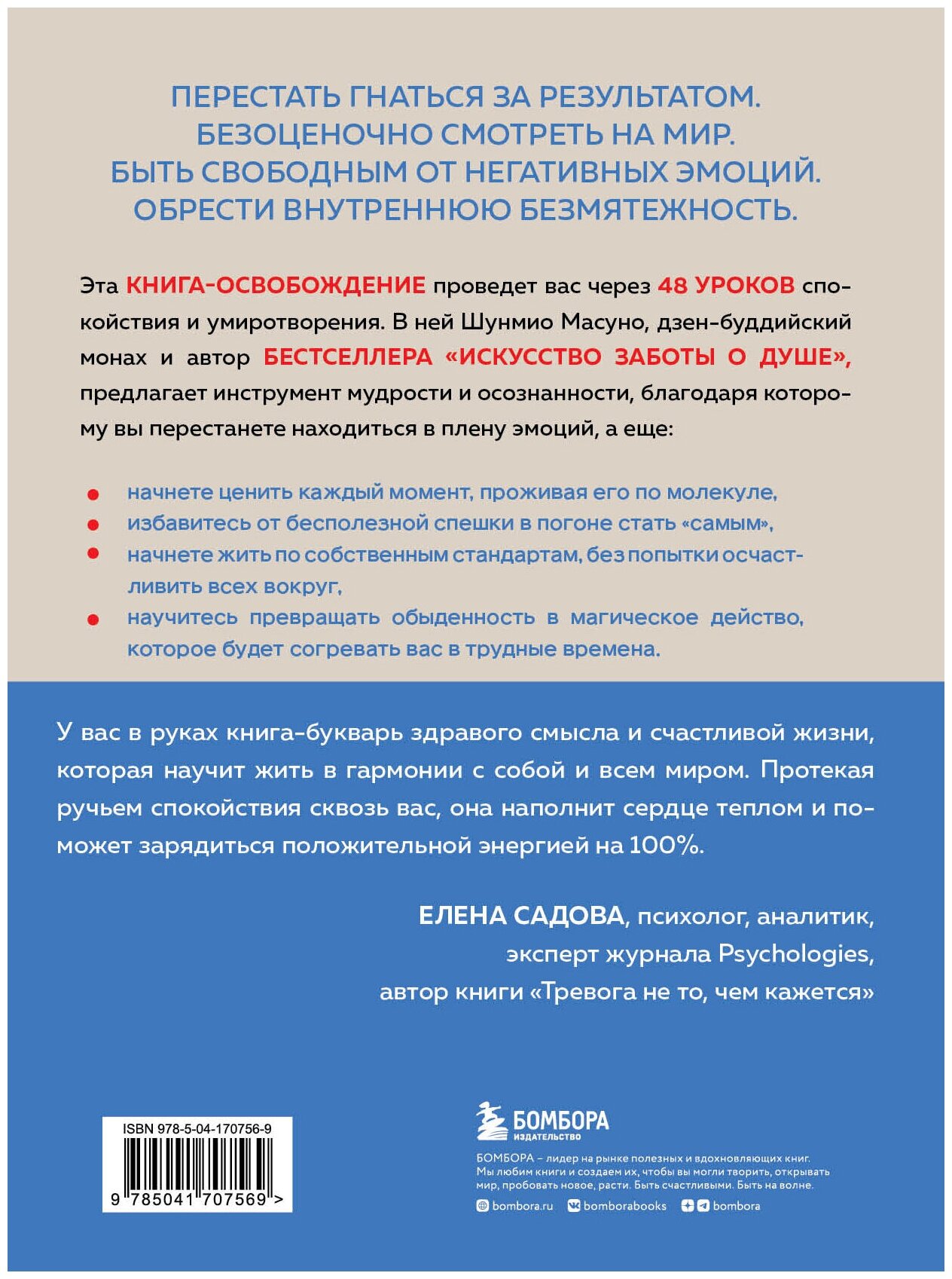 Эта книга-освобождение проведет вас через 48 уроков спокойствия и умиротворения. В ней Шунмио Мансуно, дзен-буддийский монах и автор бестселлера "Искусство заботы о душе", предлагает инструмент мудрости и осознанности, благодаря которому вы перестанете находится в плену эмоций, а еще:
