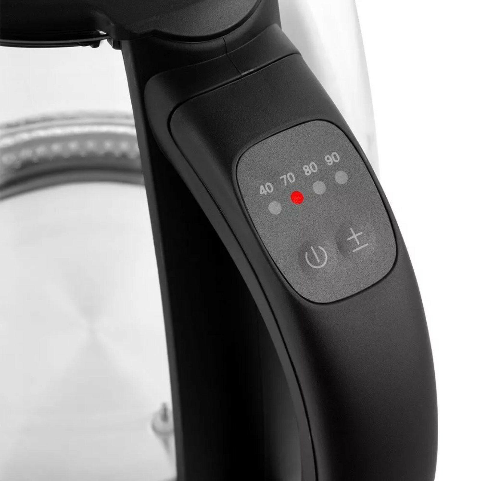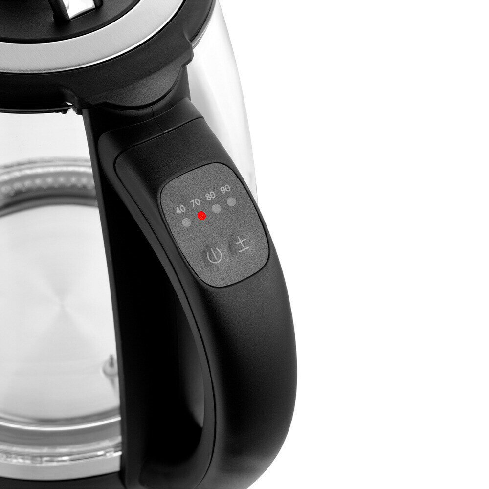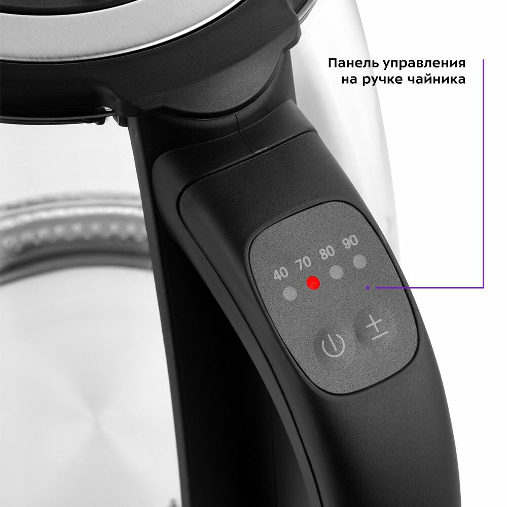 На ручке чайника расположены: кнопка вкл/выкл, при удержании которой включается режим поддержания температуры, кнопка выбора температурных режимов работы и световые индикаторы, указывающие на выбранную температуру нагрева.