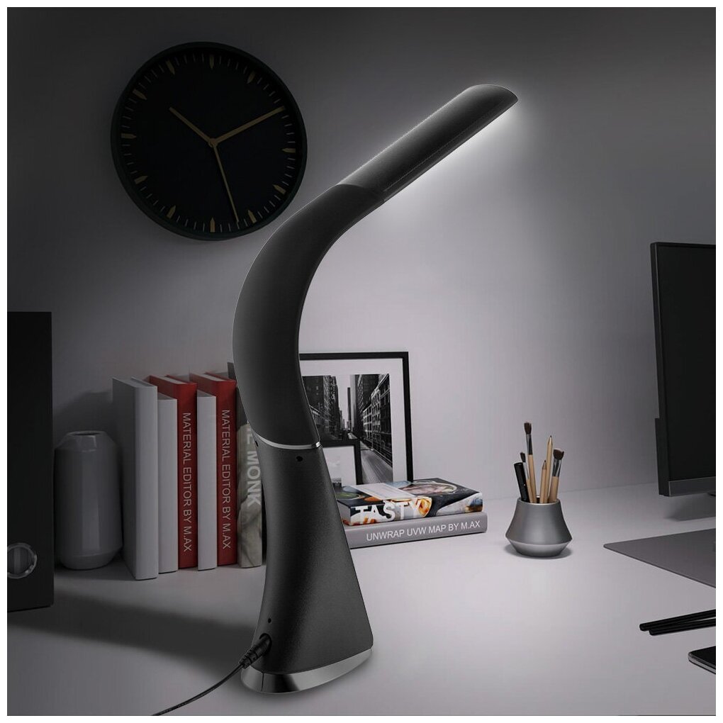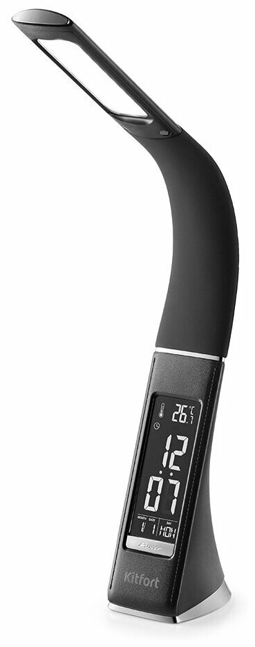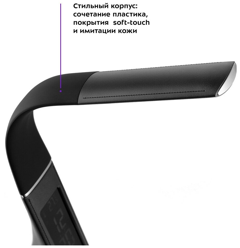 Эргономическая светодиодная лампа, которая отлично подойдёт для освещения рабочего пространства дома или в офисе, работает в режиме холодного света. Лампа складывается и не занимает много места, её удобно брать с собой. Благодаря регулировке штанги и рассеивателя вы можете настроить лампу комфортно для использования. Штанга имеет угол наклона 150°, а рассеиватель — 180°. В лампе есть часы с датой и будильником, а также на дисплее отображается температура в комнате. Передняя панель предназначена для настройки освещения. С помощью кнопки «Вкл/Выкл» можно регулировать яркость освещения, всего лампа имеет 3 уровня яркости. Всего лампа имеет 3 уровня яркости. Кнопка включения лампы служит переключателем между режимами яркости: первое нажатие — минимальная яркость, следующее нажатие — средняя яркость освещения, третье нажатие — максимальная яркость освещения. Лампа выполнена в лаконичном минималистичном дизайне. Корпус лампы соединяет в себе сочетание пластика, покрытия soft-touch и имитации кожи. Такое устройство легко впишется в любой интерьер. На обратной стороне лампы при помощи кнопок «Больше» и «Меньше» можно настраивать время, дату, мелодию и повтор будильника, а также устанавливать необходимую температуру.