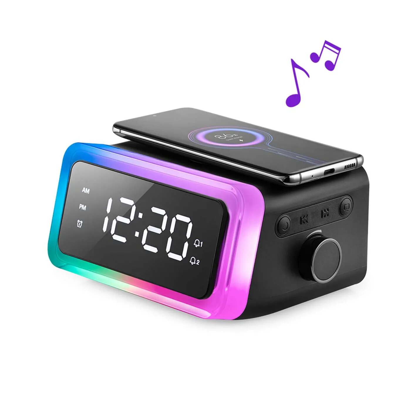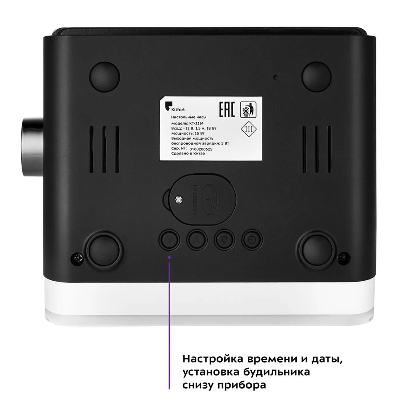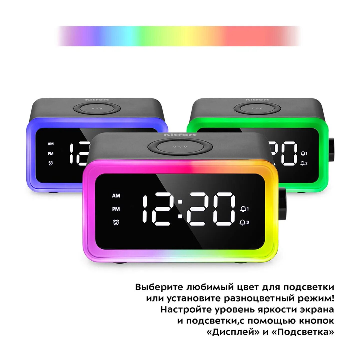 Настольные часы Kitfort КТ-3314 с беспроводной зарядкой выполняют сразу несколько функций: показывают время, могут служить будильником, светильником и беспроводной колонкой. Благодаря стильному лаконичному дизайну, часы легко впишутся в любой интерьер. Благодаря беспроводной зарядке Qi, встроенной в верхнюю часть корпуса, вы можете с легкостью заряжать телефон, часы или другие устройства, поддерживающие функцию беспроводной зарядки. Когда прибор полностью зарядится, индикатор на часах загорится зелёным. На настольных часах вы можете установить 2 будильника. Сигнал будильника можно отложить на 15 минут или отключить. Чтобы отложить сигнал будильника, нажмите на верхнюю кнопку на часах до щелчка. Кнопка «Время» - включает режим настройки времени, переключает настройки часов и минут. Кнопками «Больше» и «Меньше» установите значение в часах и минутах. «Будильник» - включает настройки времени будильника. Яркость дисплея и подсветки настраиваются. Кнопка «Дисплей» - циклически переключает 3 уровня яркости дисплея и выключает её. Кнопкой «Подсветка» вы устанавливаете разноцветную подсветку или же однотонную подсветку, которая плавно сменяется 7 цветами. Используйте часы как колонку и слушайте музыку, аудиокниги или подкасты. Управлять устройством вы можете с телефона через Bluetooth или на самом устройстве. Регулятором громкости настройте громкость, кнопками «Далее» и «Назад» переключайте треки. В комплектации с часами идёт блок питания и батарейка CR2032, чтобы при отключении от источника питания, заданные вами настройки не сбились.