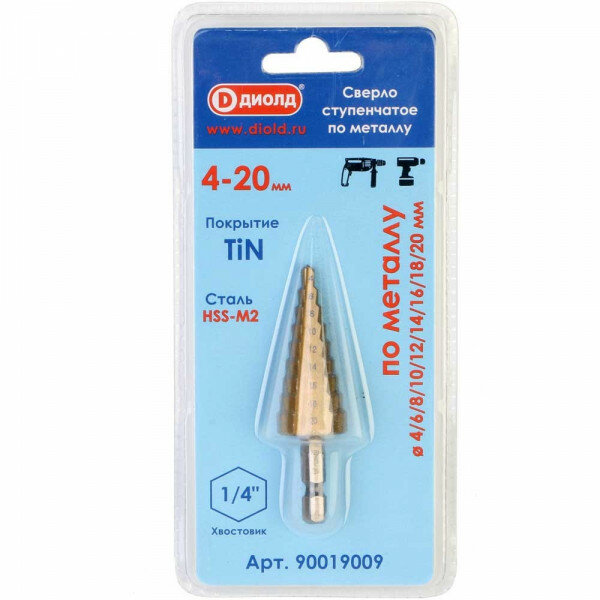 Сверло предназначено для сверления отверстий переменного диаметра. TIN сверло имеет износостойкое покрытие–нитрид титана. Сталь HSS–M2 долго сохраняет свою режущую кромку, обладает высокой теплостойкостью. Рекомендуется работать с использованием СОЖ.