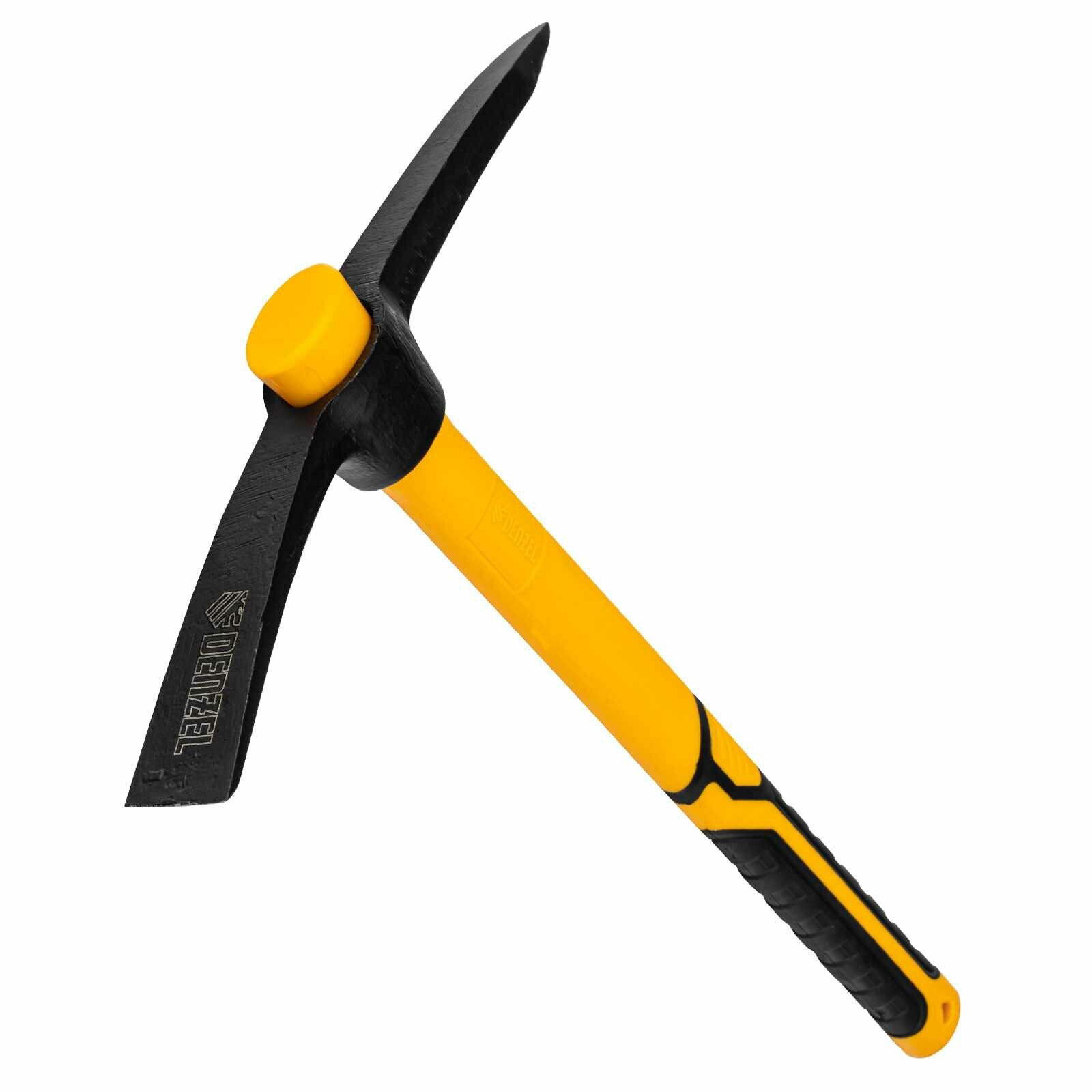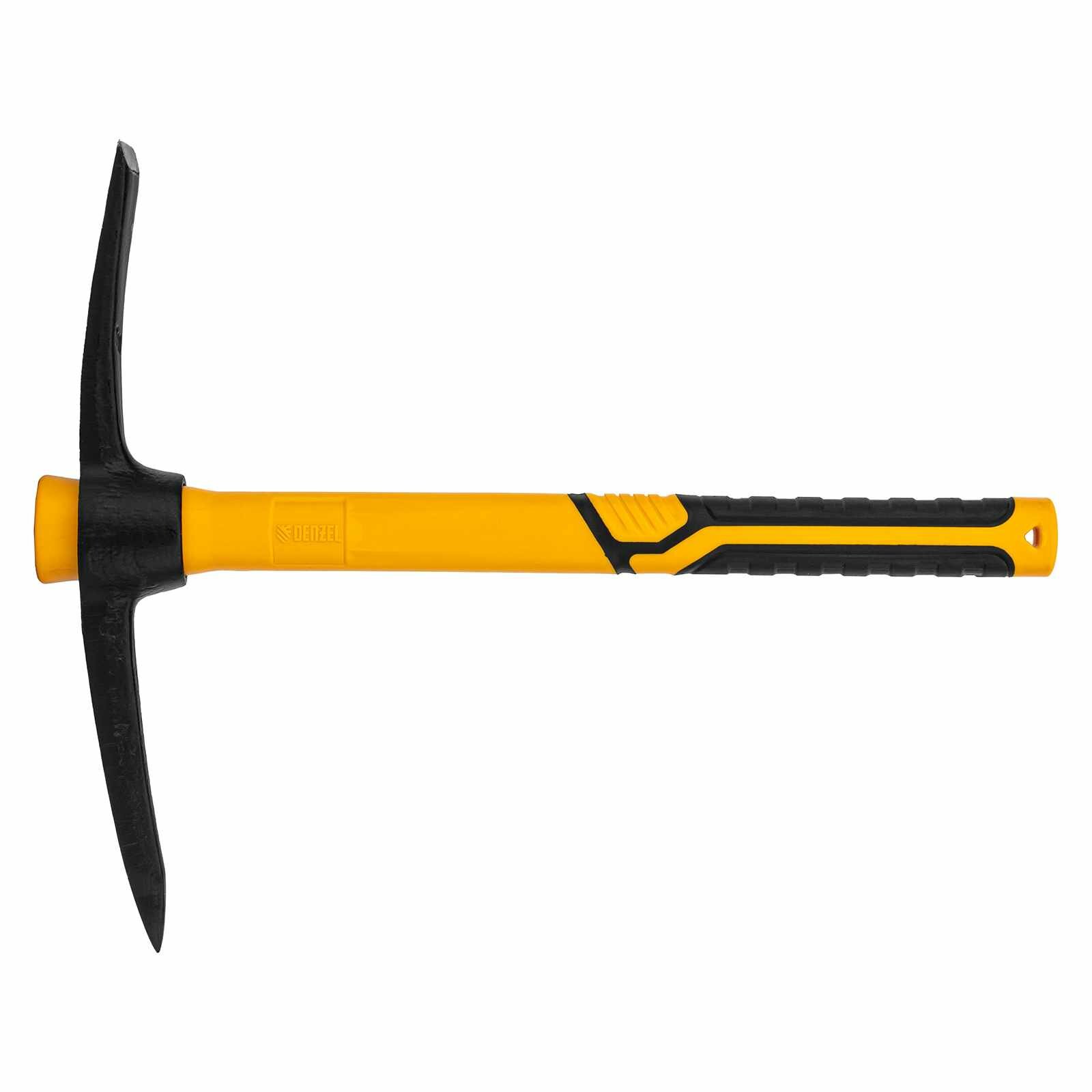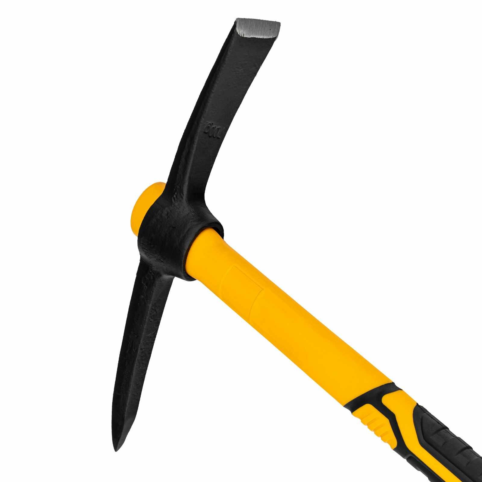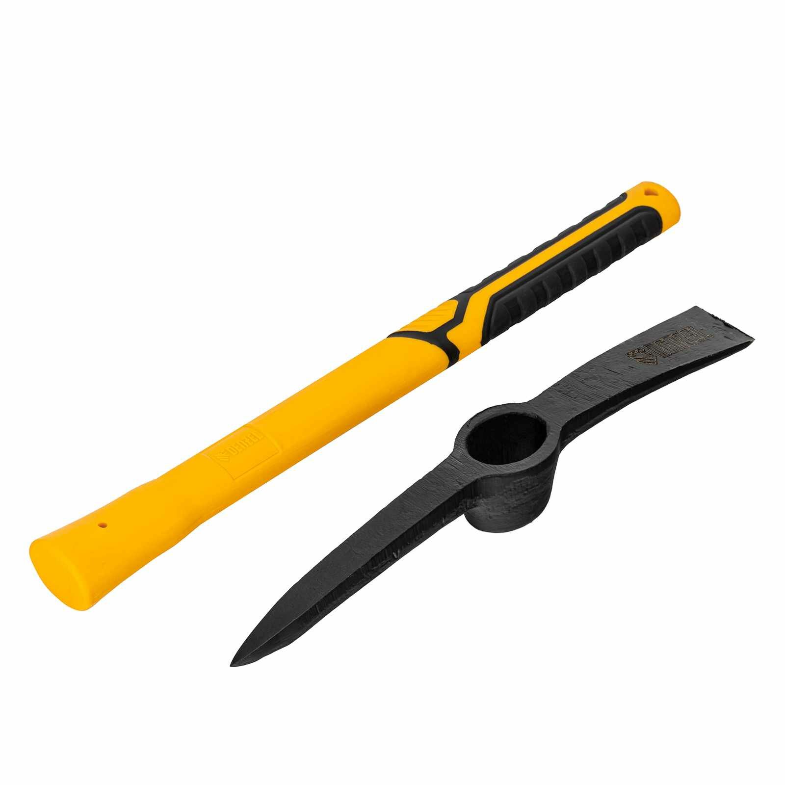 Кирка - ручной ударный инструмент, предназначенный для работы по камню, каменистому грунту, очень плотному грунту, для разрушения старой кладки, льда, бетона и т.д.Рабочая часть изготовлена из стали 65Г методом ковки, режущие кромки закалены на твердость 45HRC и заточены.Внутри пластиковой рукоятки расположен фибергласовый стежень, значительно увеличивающий ее прочность. Места хвата обрезинены и имеют ярко выраженный противоскользящий рельеф.Кирки длиной 385 мм предназначены для строительных работ, там где важна точность и аккуратность.