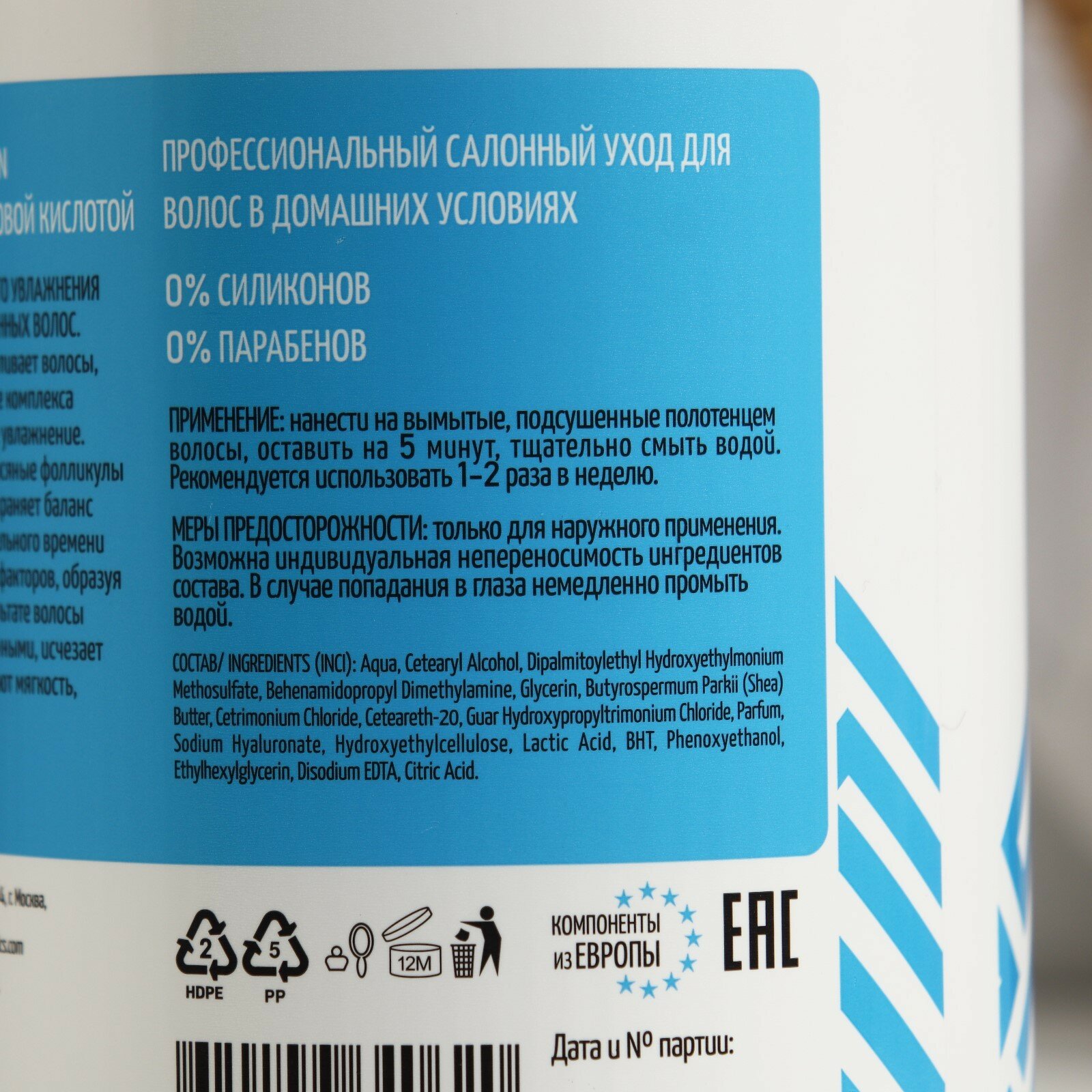 | Состав | Aqua, Cetearyl Alcohol, Dipalmitoylethyl Hydroxyethylmonium Methosulfate, Behenamidopropyl Dimethylamine, Glycerin, Butyrospermum Parkii (Shea) Butter, Cetrimonium Chloride, Ceteareth-20, Cyclopentasiloxane, Dimethiconol, Guar Hydroxypropyltrimonium Chloride, Parfum, Sodium Hyaluronate, Hydroxyethylcellulose, Lactic Acid, BHT, Phenoxyethanol, Ethylhexylglycerin, Disodium EDTA, Citric Acid |