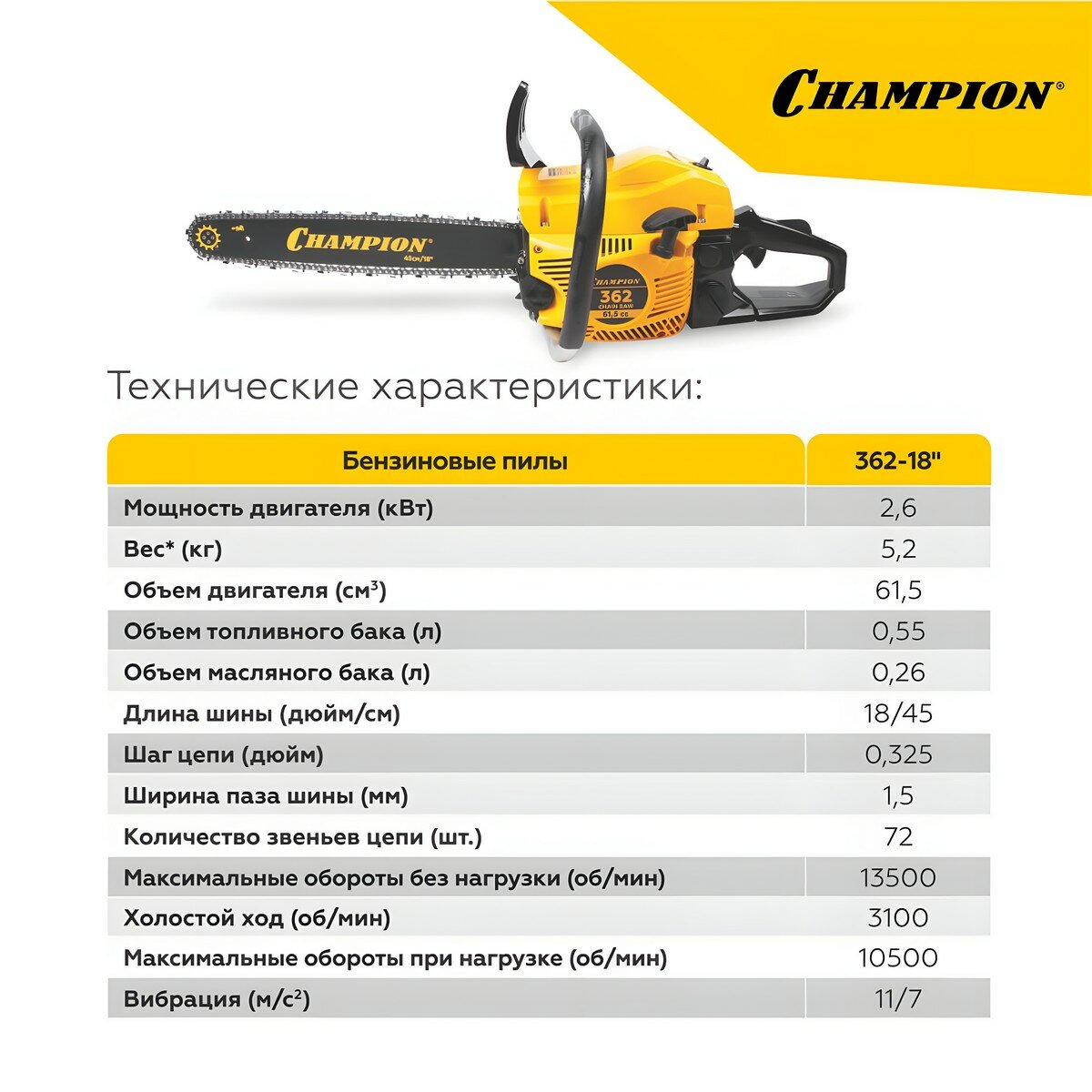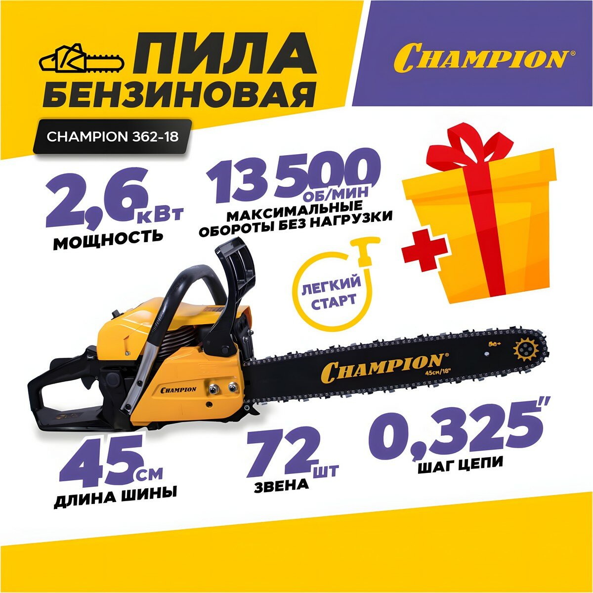 бензопила CHAMPION 362 2600Вт шина 45см + подарок (A362-18)
