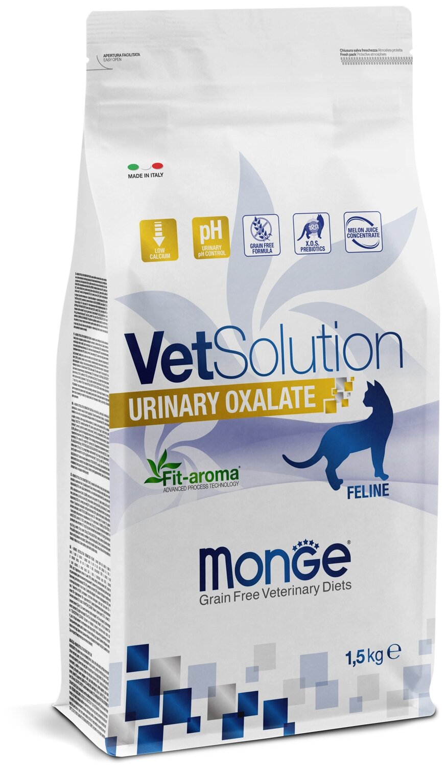 Monge VetSolution Urinary Oxalate Feline - это полноценный диетический корм для кошек, разработанный для уменьшения образования оксалатных камней. Содержит концентрат сока дыни для нейтрализации свободных радикалов, зеленый чай для поддержки мочеиспускания и ксило-олигосахариды (XOS) для защиты кишечной микробиоты. Состав характеризуется низким содержанием кальция, низким содержанием витамина D и подщелачивающими свойствами мочи.Состав:Гидролизованный белок лосося, тапиока, картофель, сушеное куриное мясо, картофельный белок, сушеный горох, животный жир (утиный жир) *, сушеная морковь, рыбий жир (лососевый жир) *, гороховая клетчатка, сушеный ананас, минеральные вещества, сушеная мякоть цитрусовых, ксило-олигосахариды (XOS 0,4%), сушеные листья зеленого чая (0,015%), продукты и побочные продукты переработки свежих фруктов и овощей (концентрат сока дыни - Cucumis melo cantalupensis источник супероксиддисмутаза 0,005%), сухой молочный протеин. * очищенный на 99,6%, сохраненный натуральными антиоксидантами.