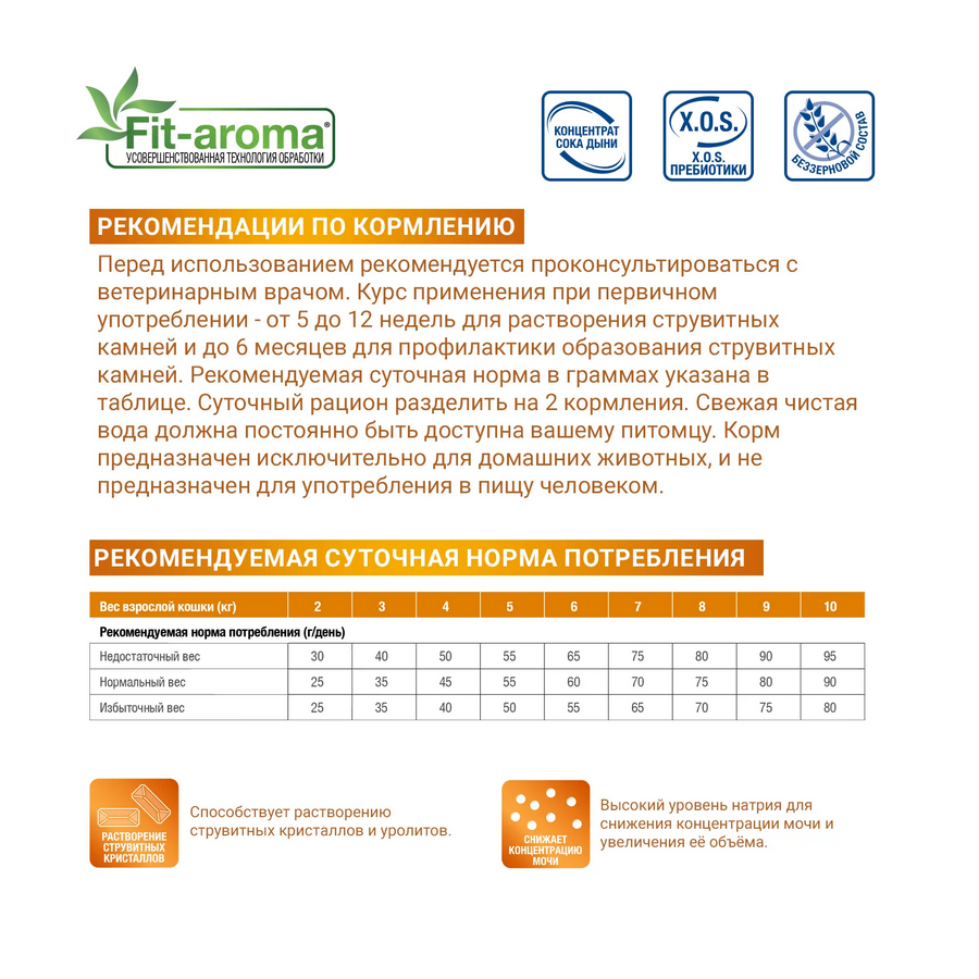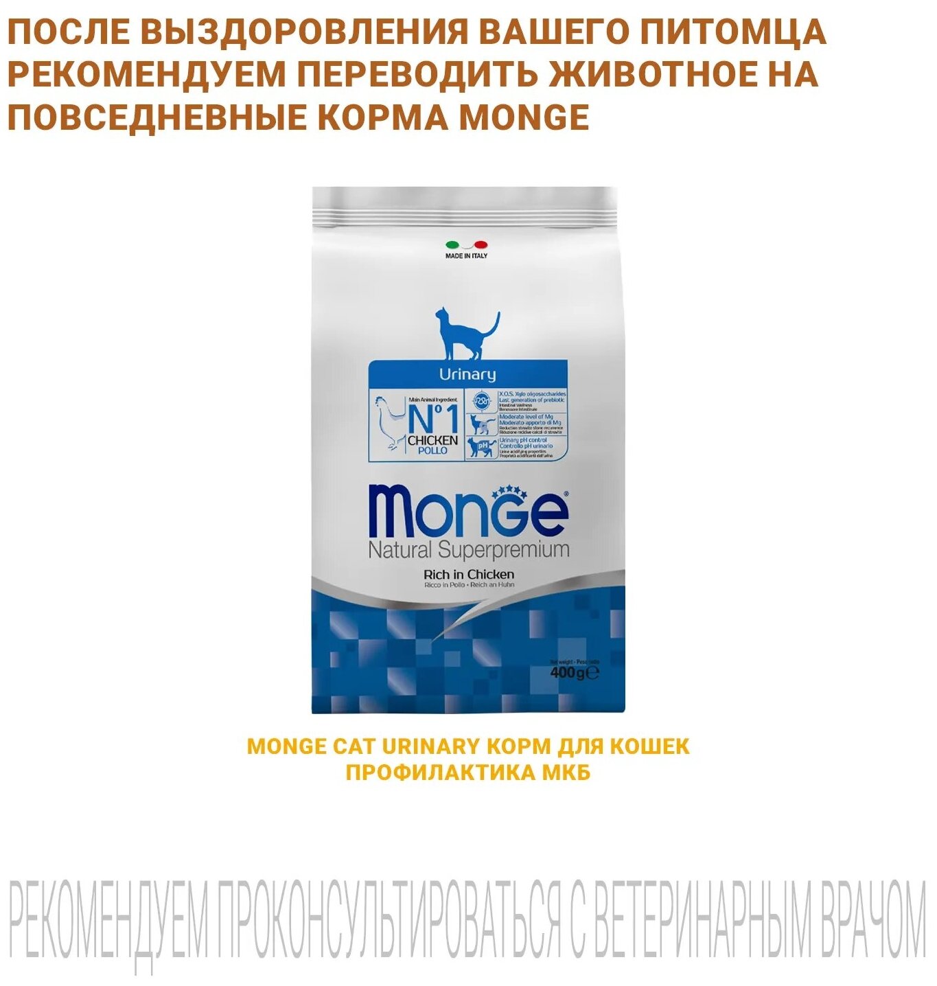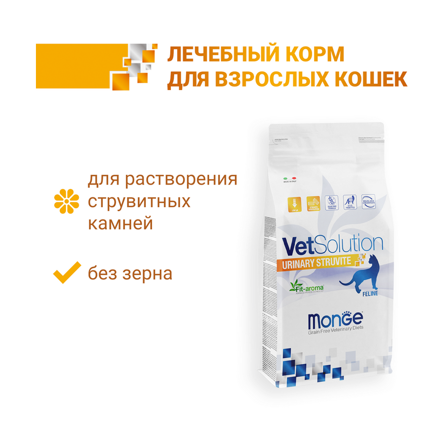 Лечебный корм Monge VetSolution Cat Urinary Struvite Уринари Струвит для кошек при заболеваниях мочеполовой системы, таких как идиопатический цистит (синдром болезненного мочевого пузыря, интерстициальный цистит) и струвитное течение мочекаменной болезни (струвитная кристаллурия и уролитиаз) 400 гMonge (Монж/Монже) VetSolution URINARY STRUVITE — полнорационный сухой диетический корм из лосося для кошек «URINARY STRUVITE» для растворения струвитных камней и профилактики их образования у кошек. Корм предназначен для лечебного питания кошек с урологическим синдромом. Содержит концентрат сока дыни для нейтрализации свободных радикалов, клюкву для поддержки функции мочевыделительной системы, ксилоолигосахариды (XOS) для защиты кишечной микробиоты, подкисляющие мочу вещества и низкий уровень магния