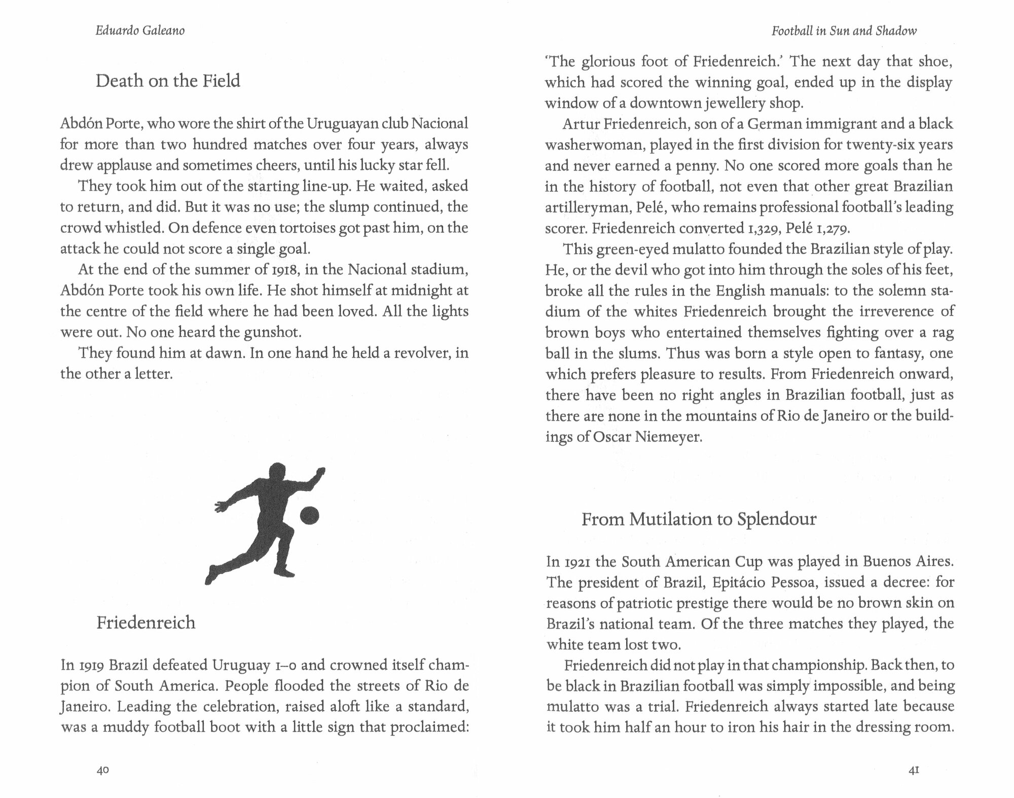'Football is a pleasure that hurts' This unashamedly emotional history of football is a homage to the romance and drama, spectacle and passion of a 'great pagan mass'. Through stories of superstition, heartbreak, tragedy, luck, heroes and villains, those who lived for football and those who died for it, Eduardo Galeano celebrates the glory of a game that - however much the rich and powerful try to control it - still retains its magic. 'The Uruguayan whose writing got right to the heart of football ... readers were never in doubt of the warmth of the blood running through his veins' Guardian 'Galeano can run rings round our glamorous football intelligentsia' When Saturday Comes 'Stands out like Pele on a field of second-stringers' New Yorker