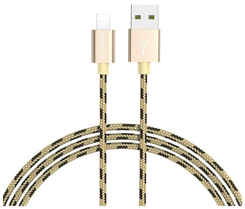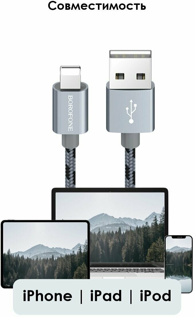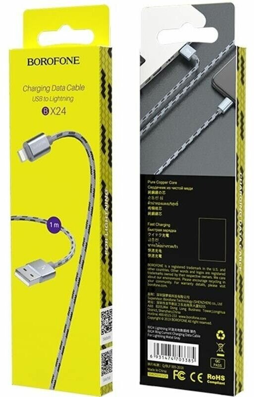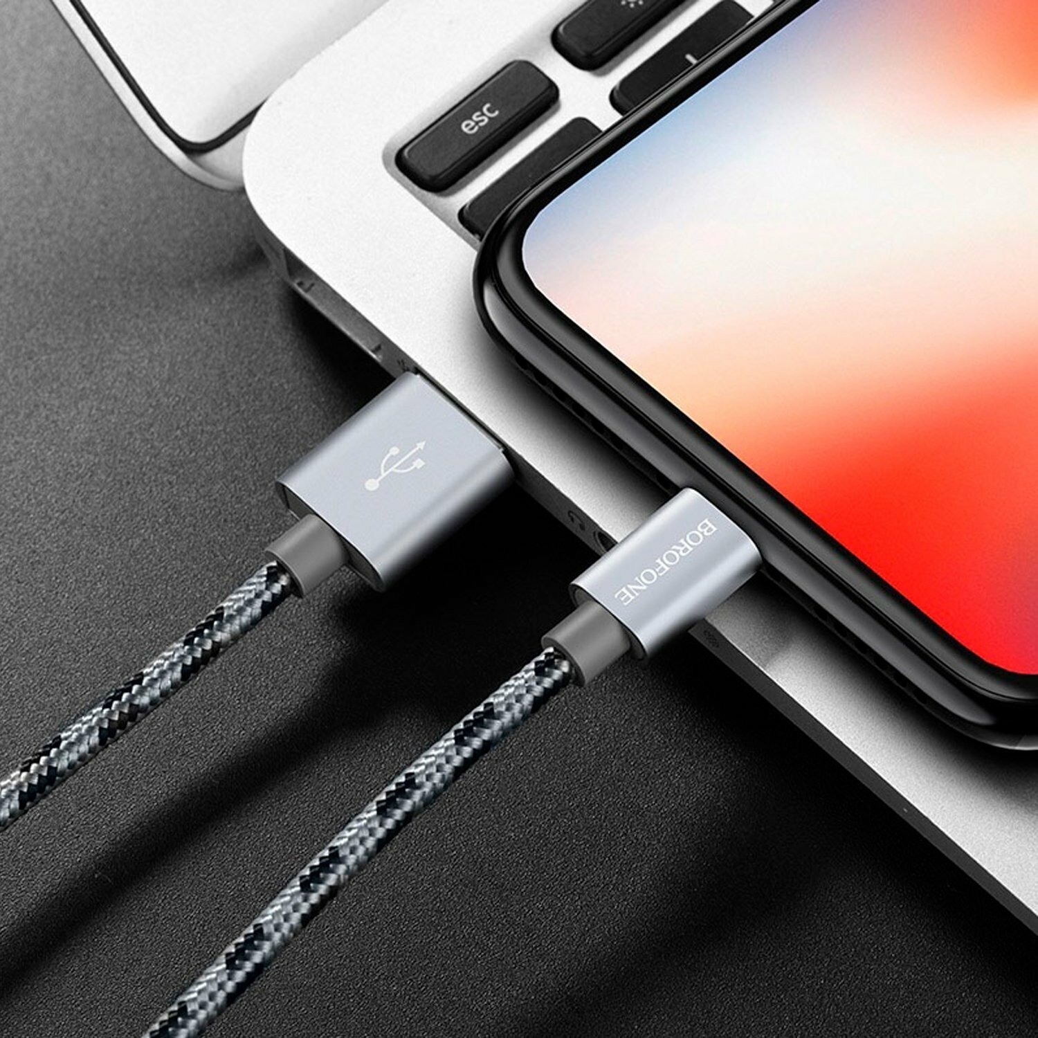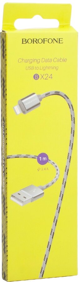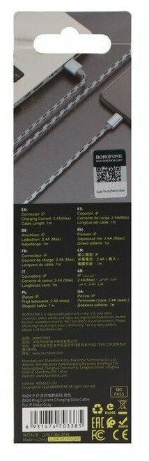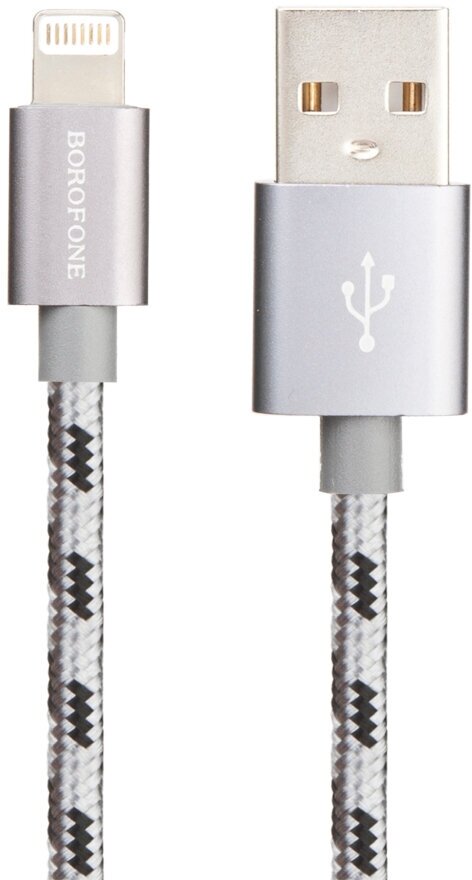 BOROFONE BX24 Ring Grey — кабель серого цвета. Длина его составляет 1 метр, а вес — 22 грамма. Благодаря наличию оплетки из нейлона провод приятен на ощупь, не истирается и не трескается, его удобно скручивать и носить в кармане. Кабель подходит для зарядки устройств с разъемом lighting, а также для передачи данных. Рядом с коннекторами располагаются серебристые вставки, провод полосатый, выкрашен в серый и черный цвета.
