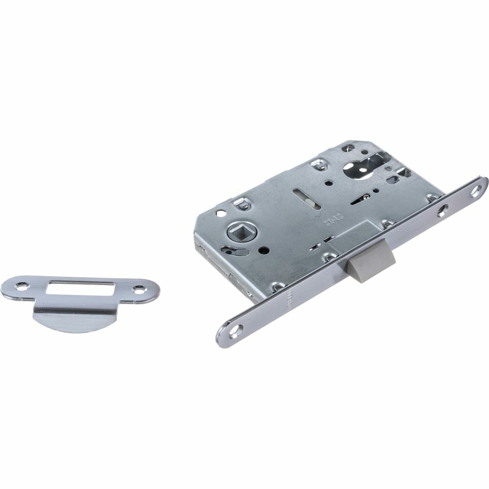 Защелка межкомнатная бесшумная под цилиндр MORELLI 1885P SC, цвет матовый хром предназначена для межкомнатных дверей с последующей установкой дверной ручки в верхнее отверстие защелки и ключевого цилиндра с накладкой на ключевой цилиндр - в нижнее. Межосевое расстояние 96 мм. Защелка имеет универсальную направленность - может быть установлена на полона как правого, так и левого отпирания. Язычок защелки выполнен из пластикого композита, что обеспечивает почти бесшумную работу. Торцевая планка защелки имеет скругленные углы, что удобно при подготовке посадочного места при врезке фрезой и задает аккуратный внешний вид врезке. Саморезы и ответная планка в цвет изделия в комплекте. Упаковка картонная с держателем для навески.