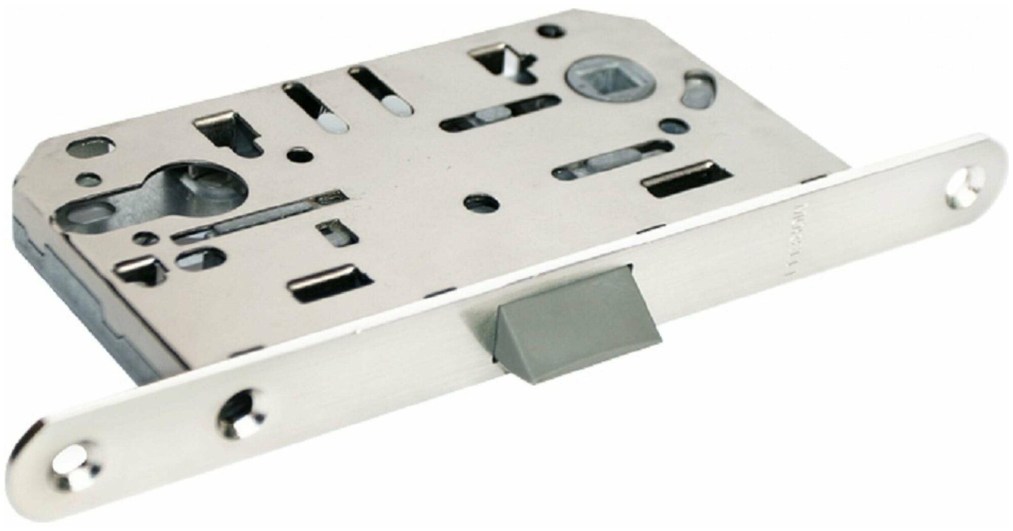 Защелка под цилиндр с пластиковым язычком используется для бесшумного запирания межкомнатных дверей ключом.