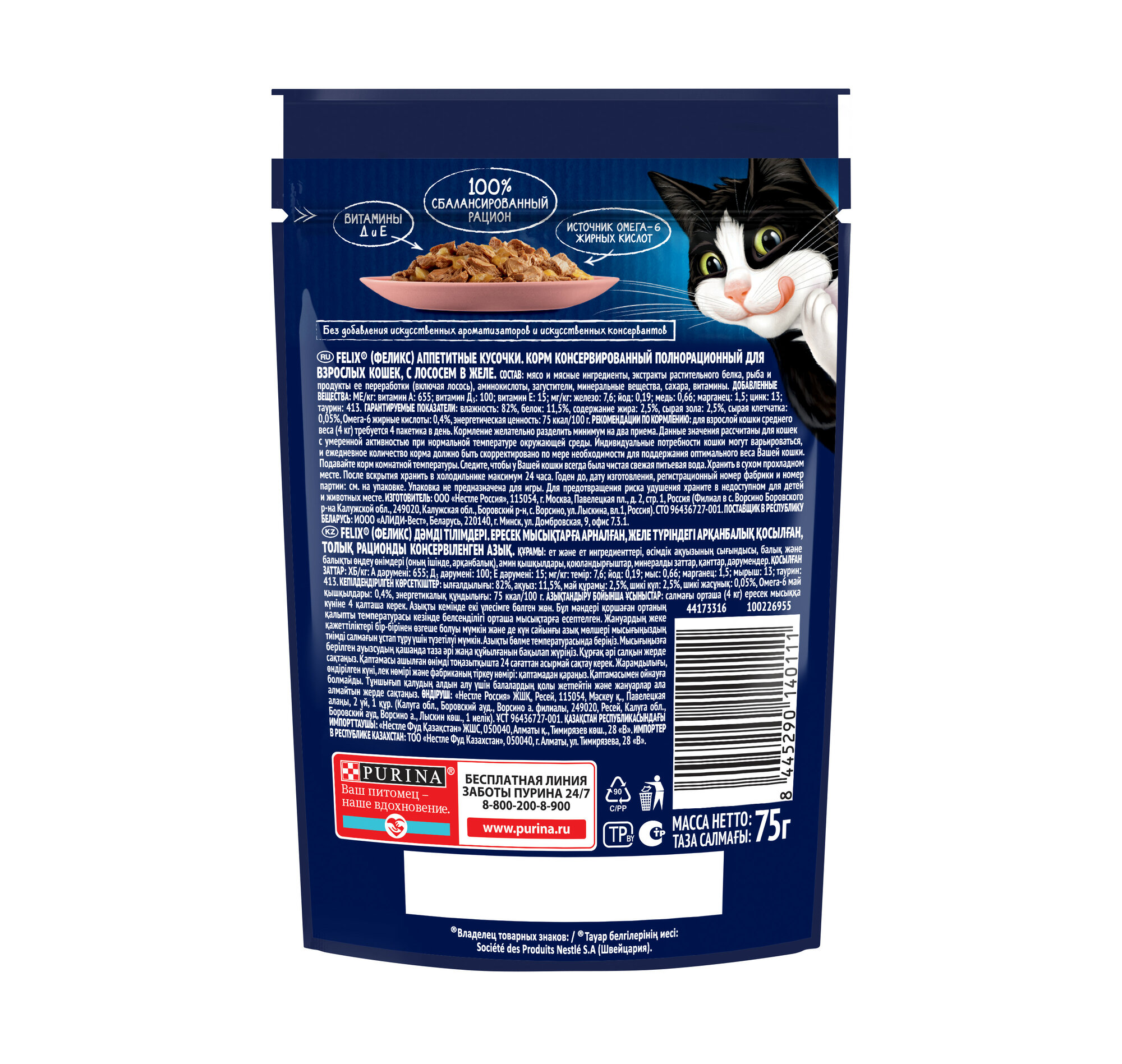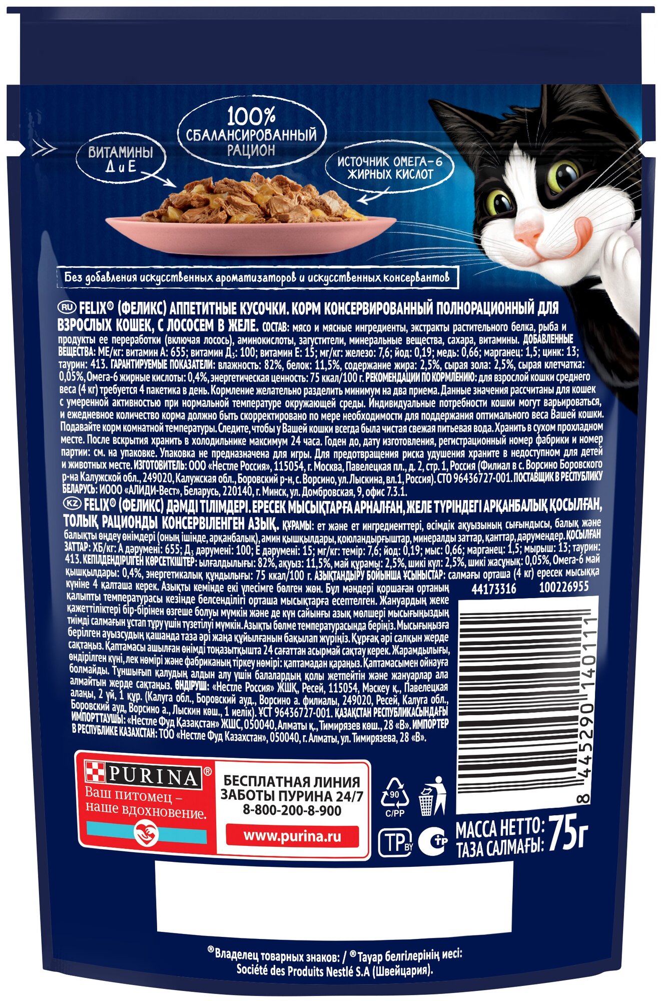 Корм влажный Felix Аппетитные кусочки предназначен для питания взрослых кошек. Сочные ломтики лосося в густом желе. Содержит витамин Д — способствует правильному усвоению кальция и фосфора. Витамин Е укрепляет иммунную систему. Омега-6 жирные кислоты придают шерсти блеск. Для взрослой домашней кошки рекомендовано употребление четырех пакетиков в сутки, для стерилизованной — трех. В наборе — 26 штук.