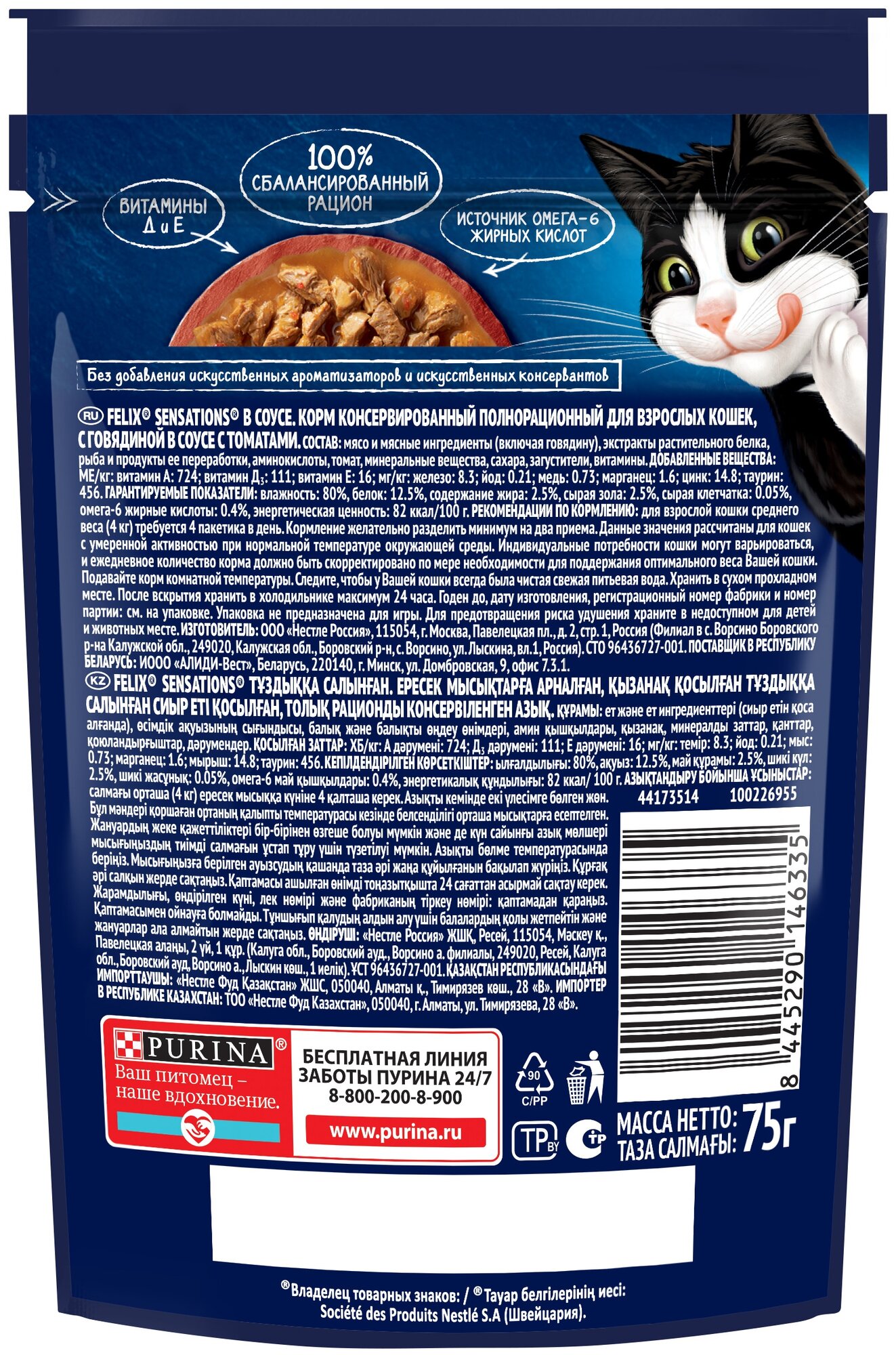 Чтобы Ваш питомец получил богатейшую палитру ощущений вкуса и аромата, эксперты Purina создали влажный корм для взрослых кошек Felix Sensations. Влажные корма для кошек Felix, созданные из высококачественных ингредиентов с заботливо приготовленными нежными кусочками в аппетитном желе подарят Вашему любимцу потрясающие ощущения и оптимальную комбинацию питательных веществ для активной и здоровой жизни. 100% сбалансированный полный рацион. Баланс минералов. Содержит витамины Д и Е. Источник Омега-6 жирных кислот. Не содержит искусственных ароматизаторов, красителей и консервантов.