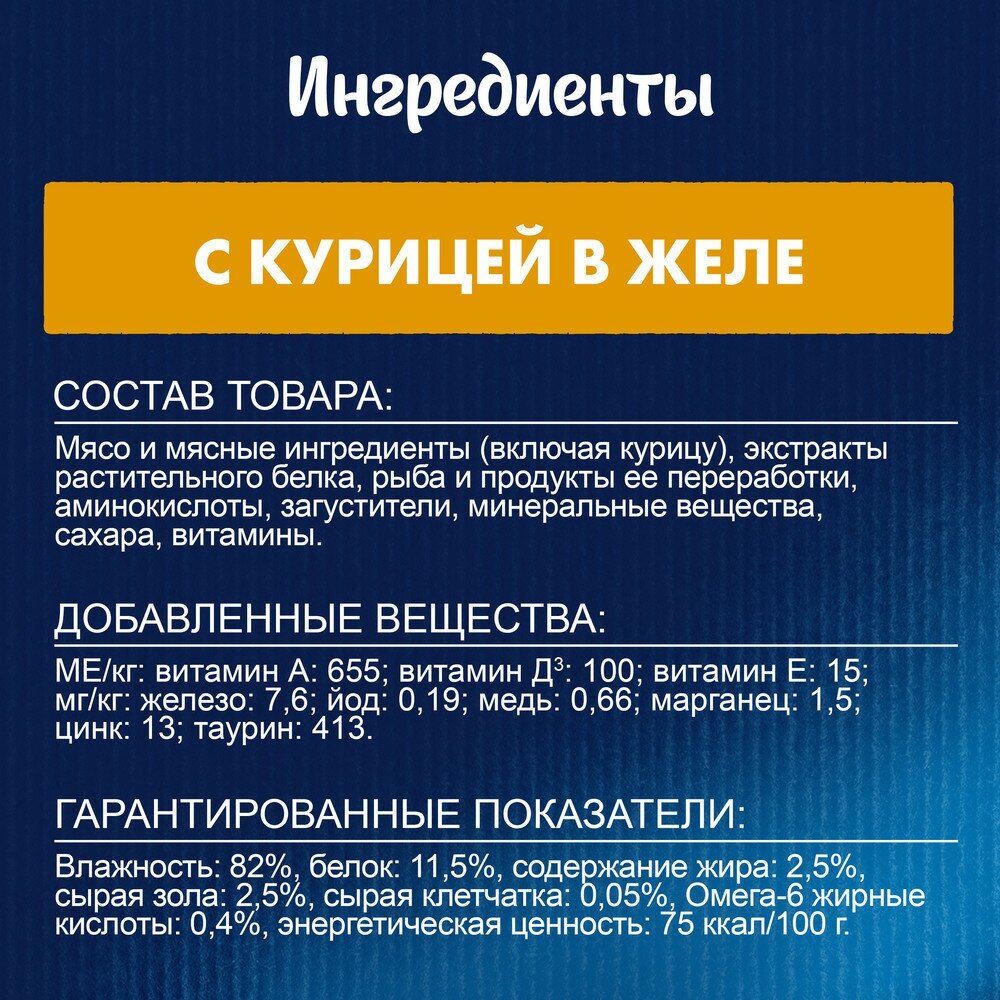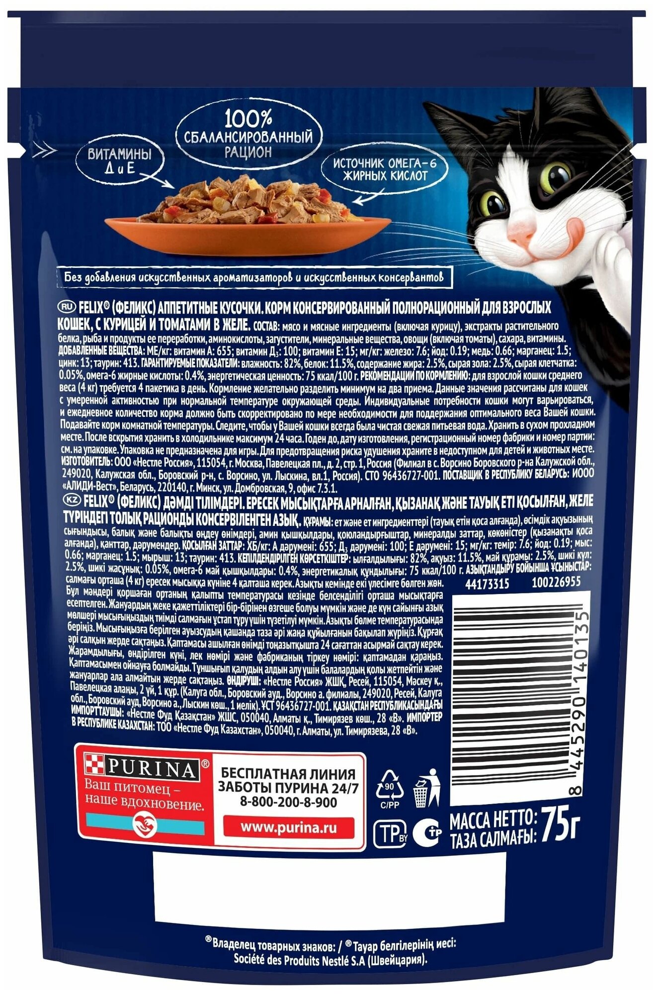 Корм влажный Felix Аппетитные кусочки предназначен для питания взрослых кошек. Сочные ломтики курицы в густом желе. Содержит витамин Д — способствует правильному усвоению кальция и фосфора. Витамин Е укрепляет иммунную систему. Омега-6 жирные кислоты придают шерсти блеск. Для взрослой домашней кошки рекомендовано употребление четырех пакетиков в сутки, для стерилизованной — трех. В наборе — 26 штук.