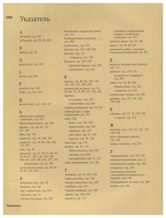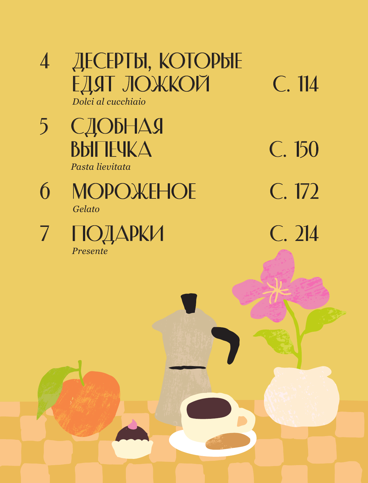 Здесь есть все виды итальянских сладостей: от маленьких печенек до больших тортов. К каждому прилагается описание, как оно встретилось на пути автора и какие эмоции в нем вызвало. После идет подробный рецепт и фотографии.