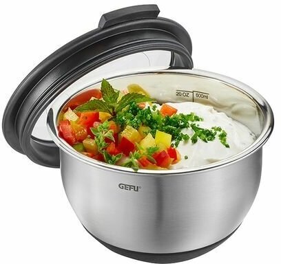 Универсальная миска с крышкой изготовлена из нержавеющей стали - матовой снаружи и глянцевой внутри. На внутреннюю поверхность нанесена мерная шкала - до 600 мл. Герметичная прозрачная крышка окантована силиконом. Дно миски покрыто силиконом для устойчивости на столе.
