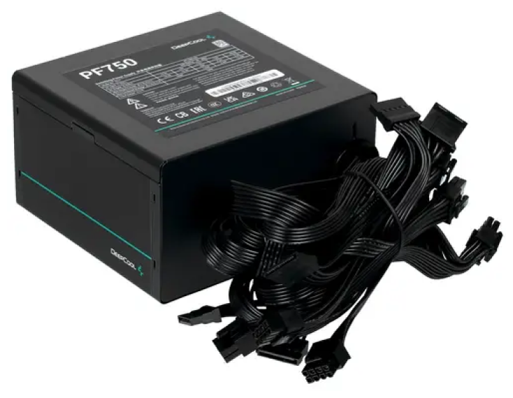 Блок питания DEEPCOOL PF750 [R-PF750D-HA0B-EU] с мощностью по всем линиям на выходе 750 Вт достаточно производителен, чтобы обеспечивать питание всем модулям игрового системного блока. В этом устройстве предусмотрены кабели черного цвета, на которых установлены как основной разъем питания, так и интерфейс 4+4 pin CPU для подключения ЦПУ, разъемы для SATA-накопителей (до 6 шт) и видеокарт (до 4 шт). Сетевой кабель поставляется вместе с БП, рассчитанным на работу при входном напряжении 200-240 В. Блок питания DEEPCOOL PF750 [R-PF750D-HA0B-EU] относится к форм-фактору ATX и отличается хорошей энергоэффективностью, подтвержденной сертификатом 80 PLUS Standart. Для обеспечения стабильного отвода тепла под нагрузкой модель снабжена малошумным кулером размером 120x120 мм. Обороты вентилятора регулируются автоматически в соответствии с рабочей нагрузкой.