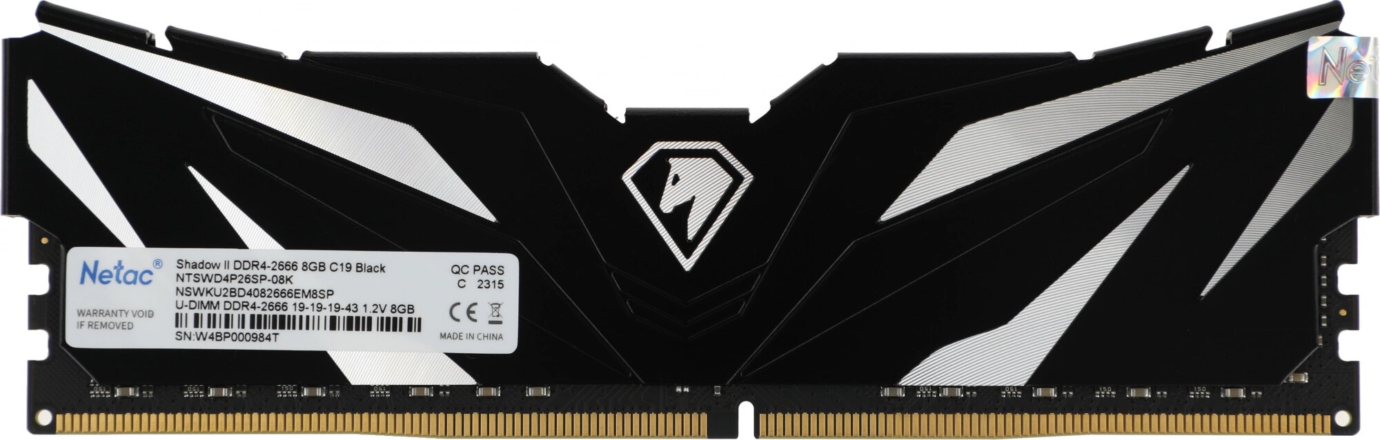 Модуль памяти Netac Shadow II Black NTSWD4P26SP-08K DIMM DDR4 емкостью 8ГБ, частотой 2666МГц (PC4-21300), non ECC, предназначен для использования в домашних или офисных персональных компьютерах (совместимость уточняйте).