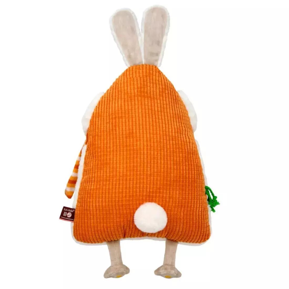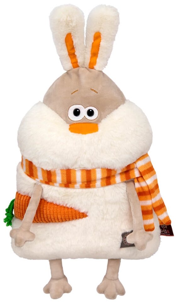 Необыкновенно уютный заяц-подушка Роджер, сшит из мягчайшего софта. На животике выполненная аппликацией морковка, а на шейке полосатый шарфик из трикотажа.